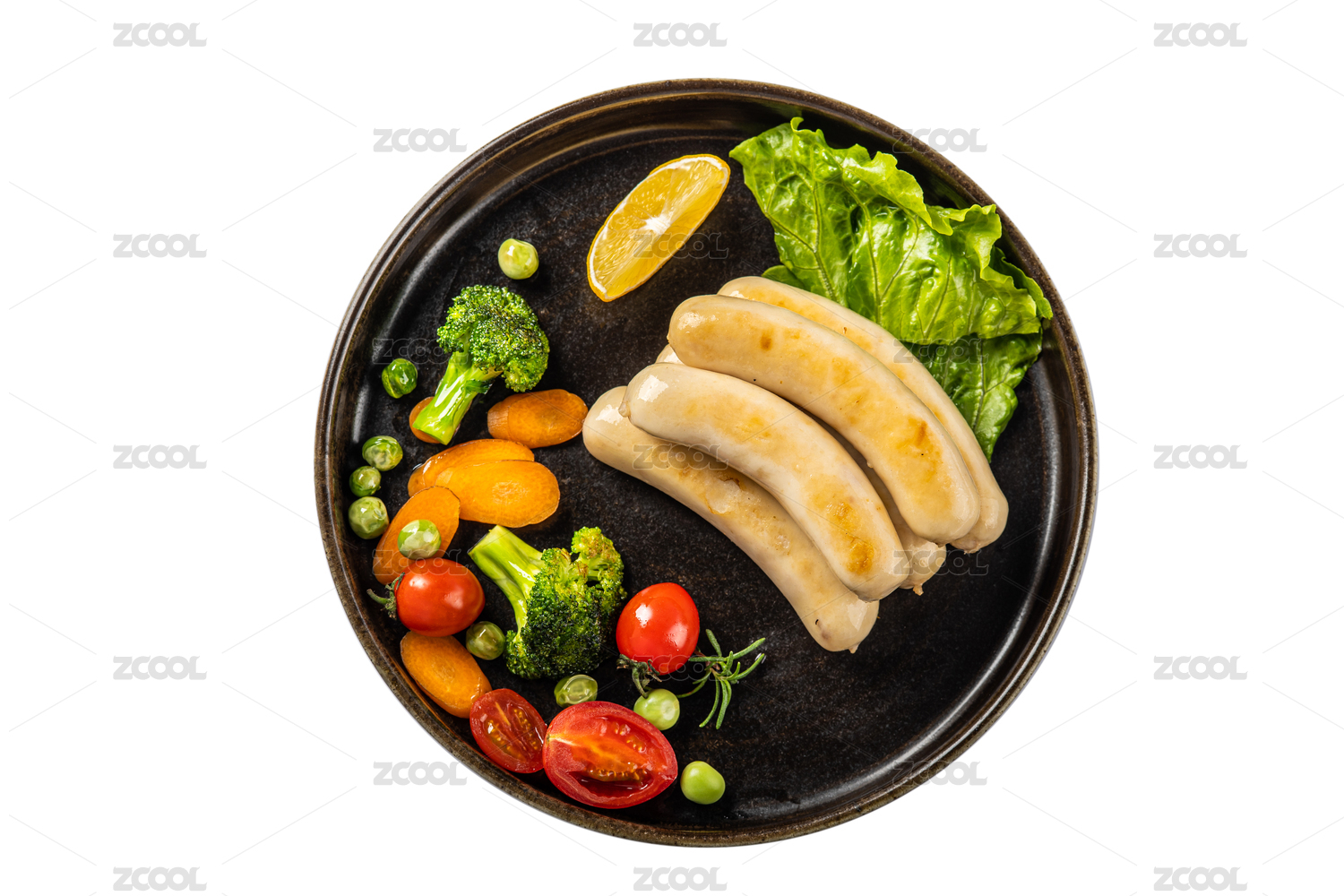 白色大理石背景上的滿滿一盤雞肉腸