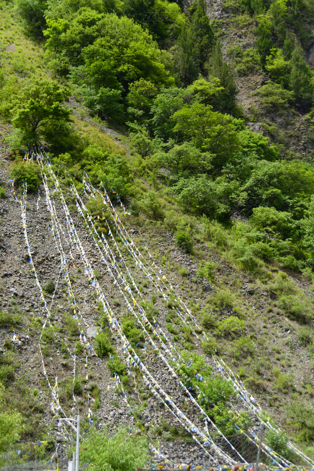 四川阿壩州的藏民在泥石流滑坡的山地上的經(jīng)幡