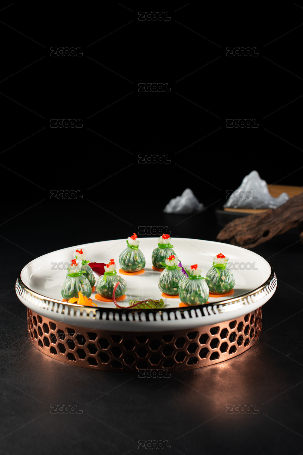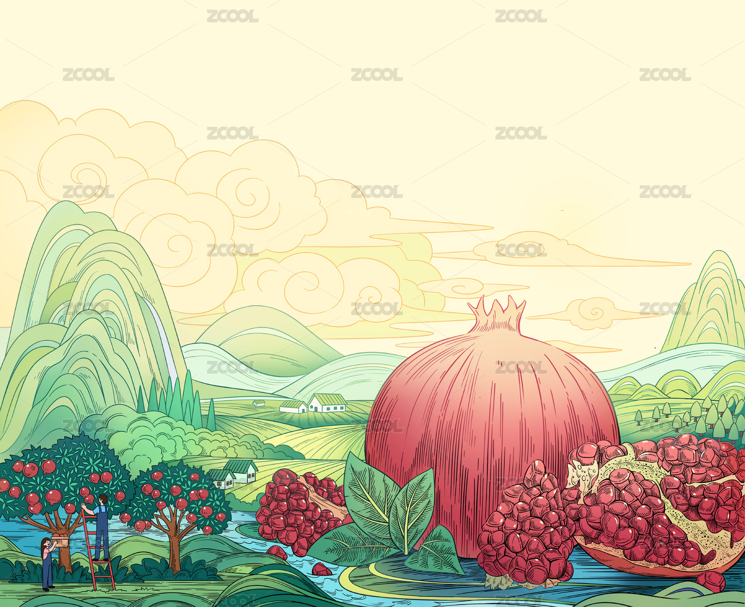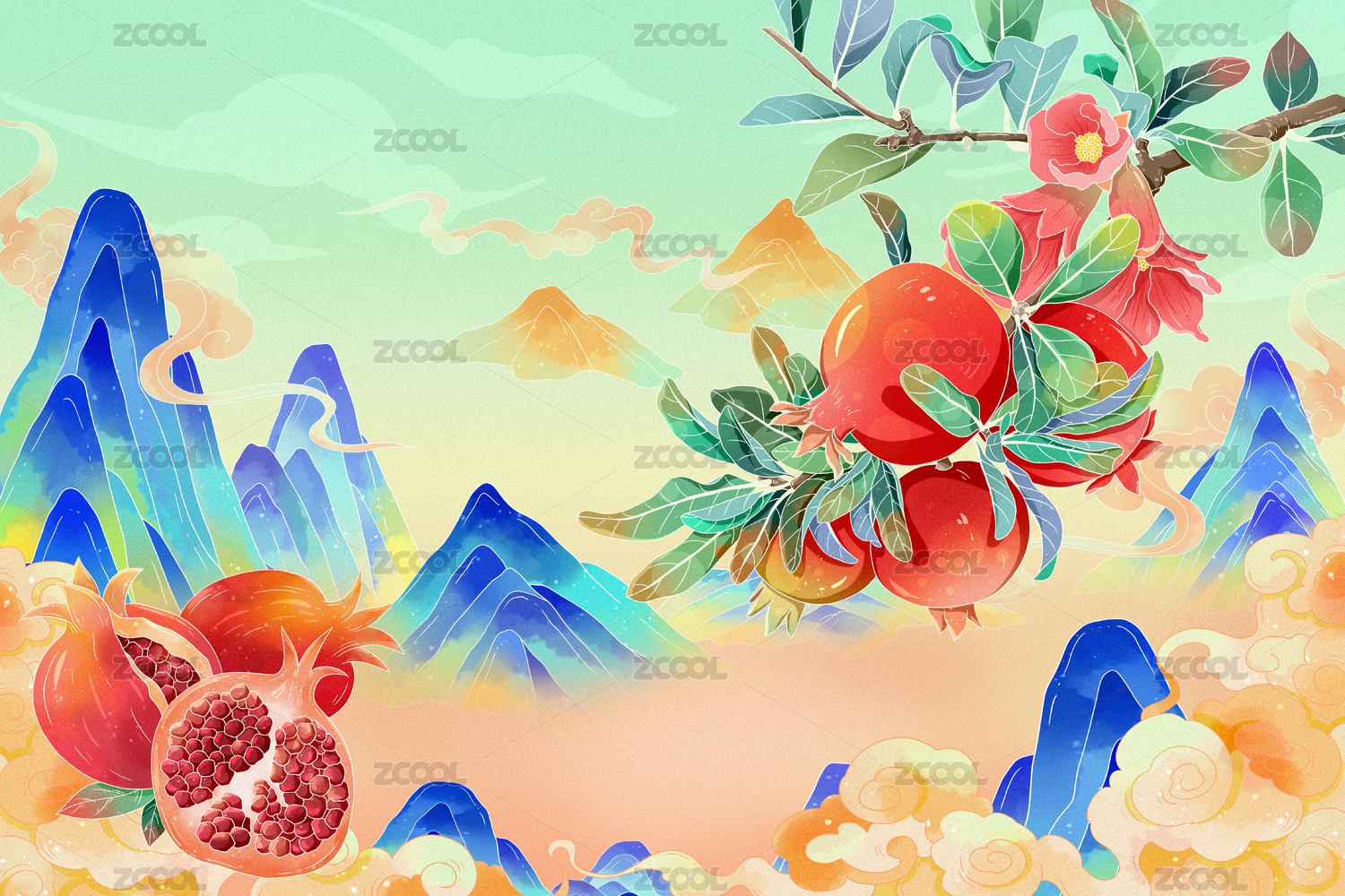 中國(guó)風(fēng)山水祥云水果石榴包裝插畫