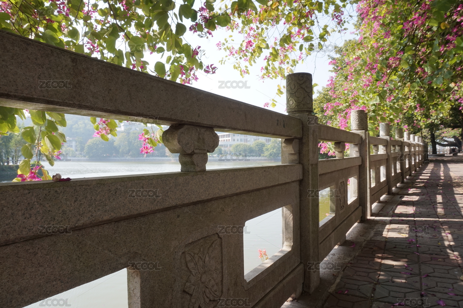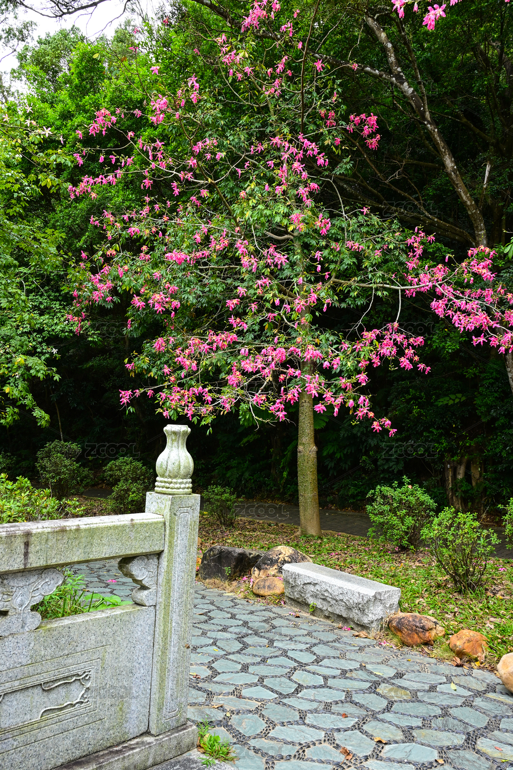深圳仙湖植物園中式石欄與盛開的異木棉景觀
