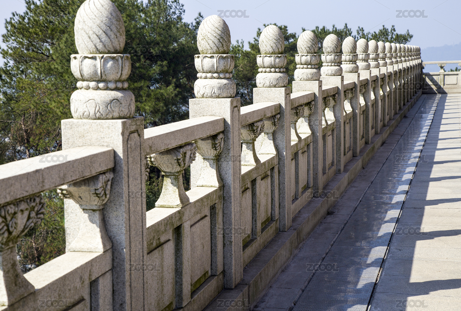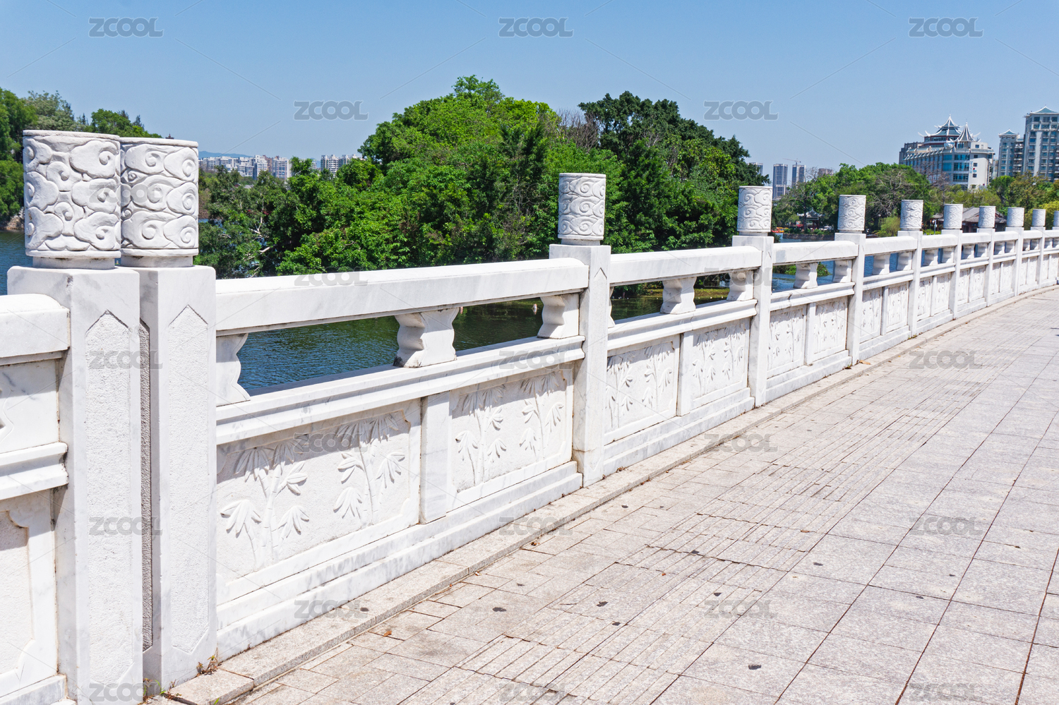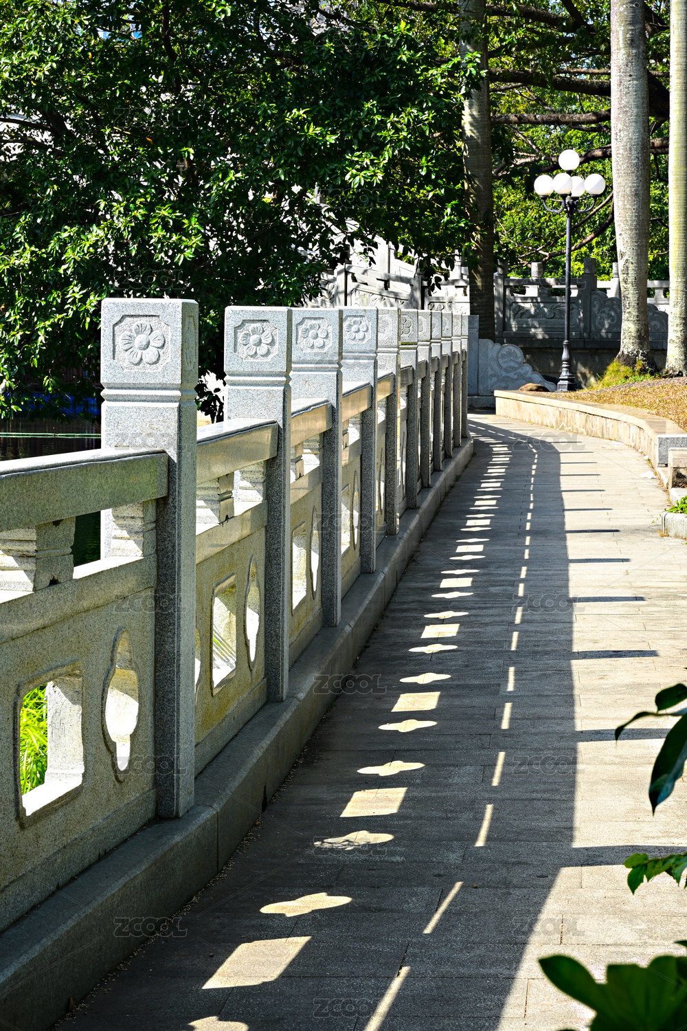 深圳荔枝公園陽光下的中式雕花欄桿步道景觀
