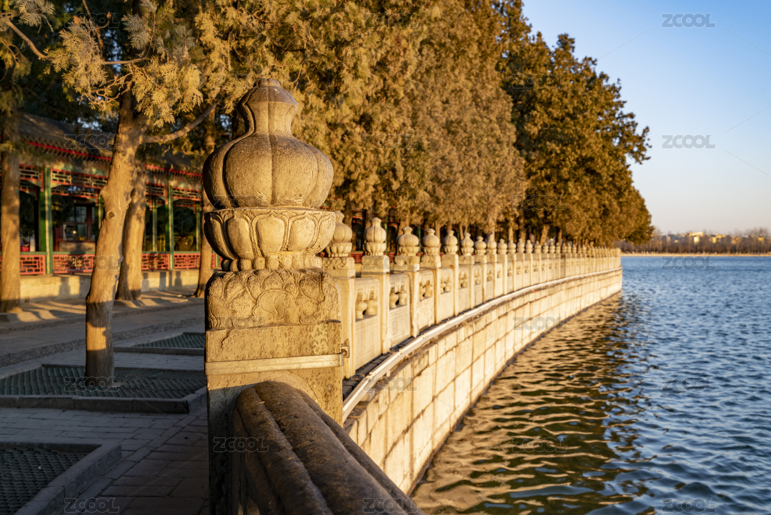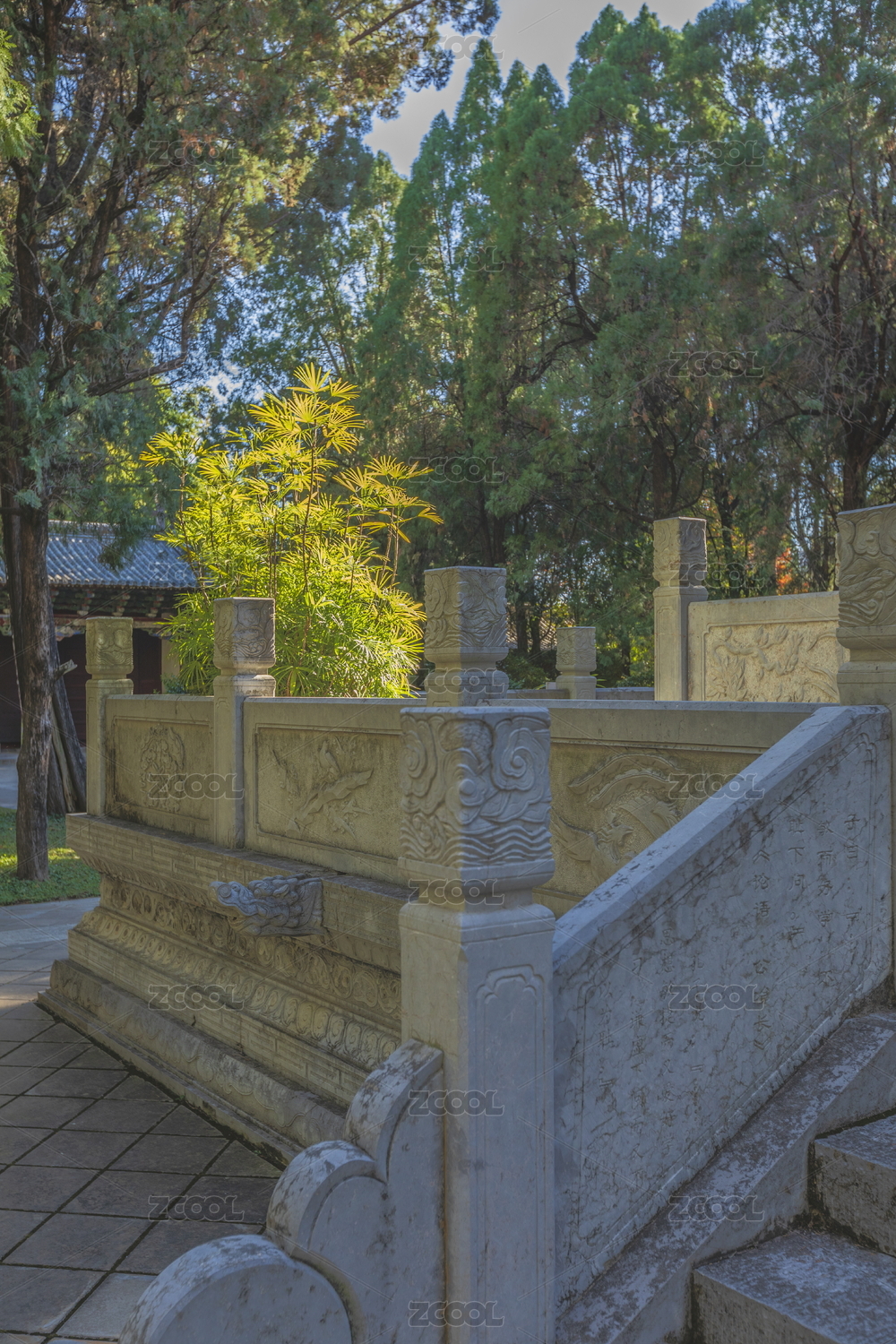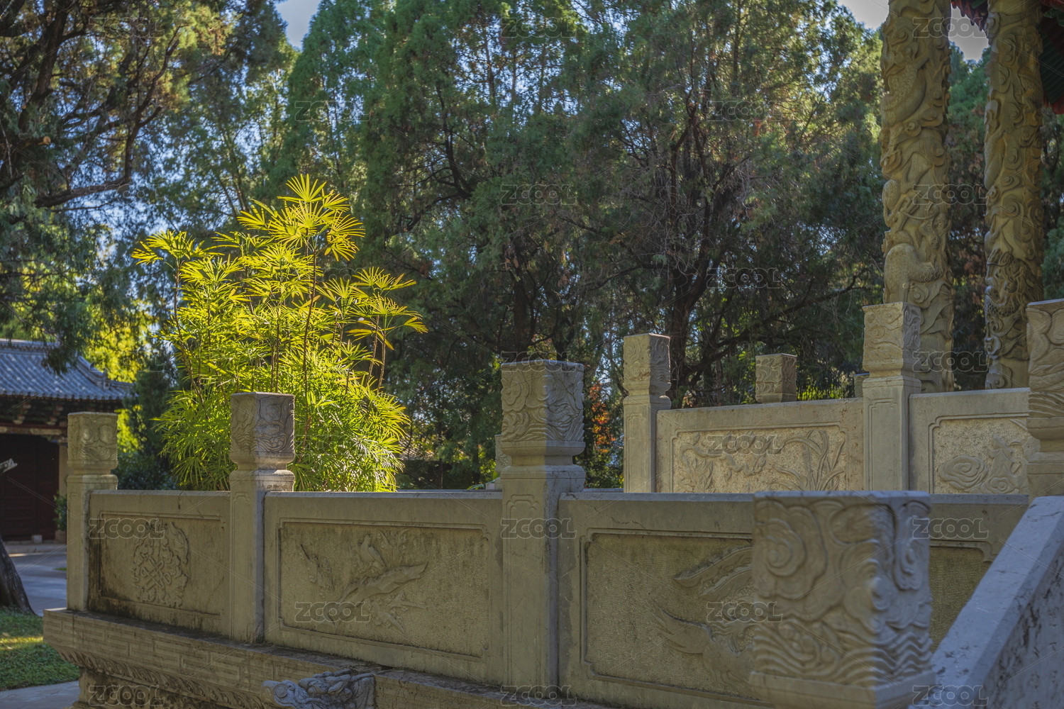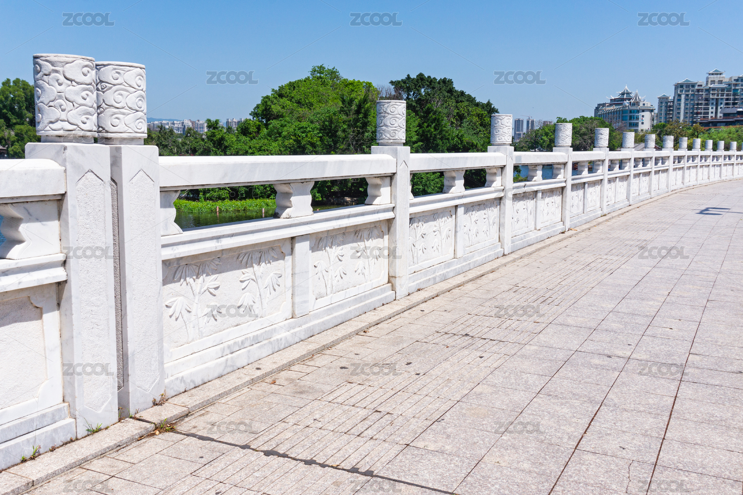 深圳荔枝公園陽光下的中式雕花欄桿步道景觀