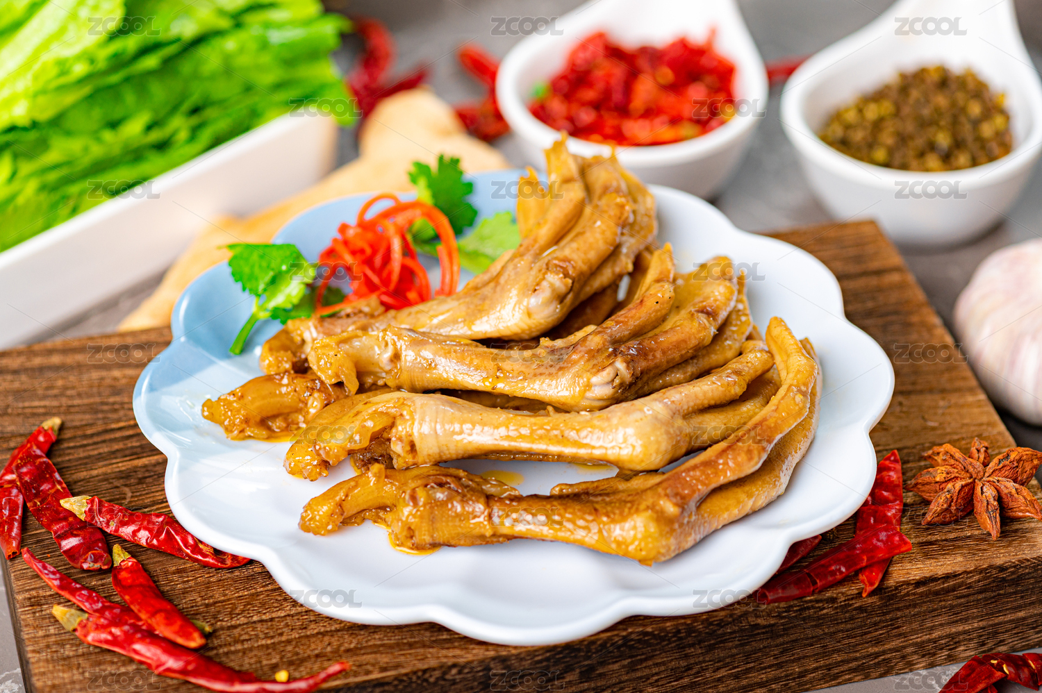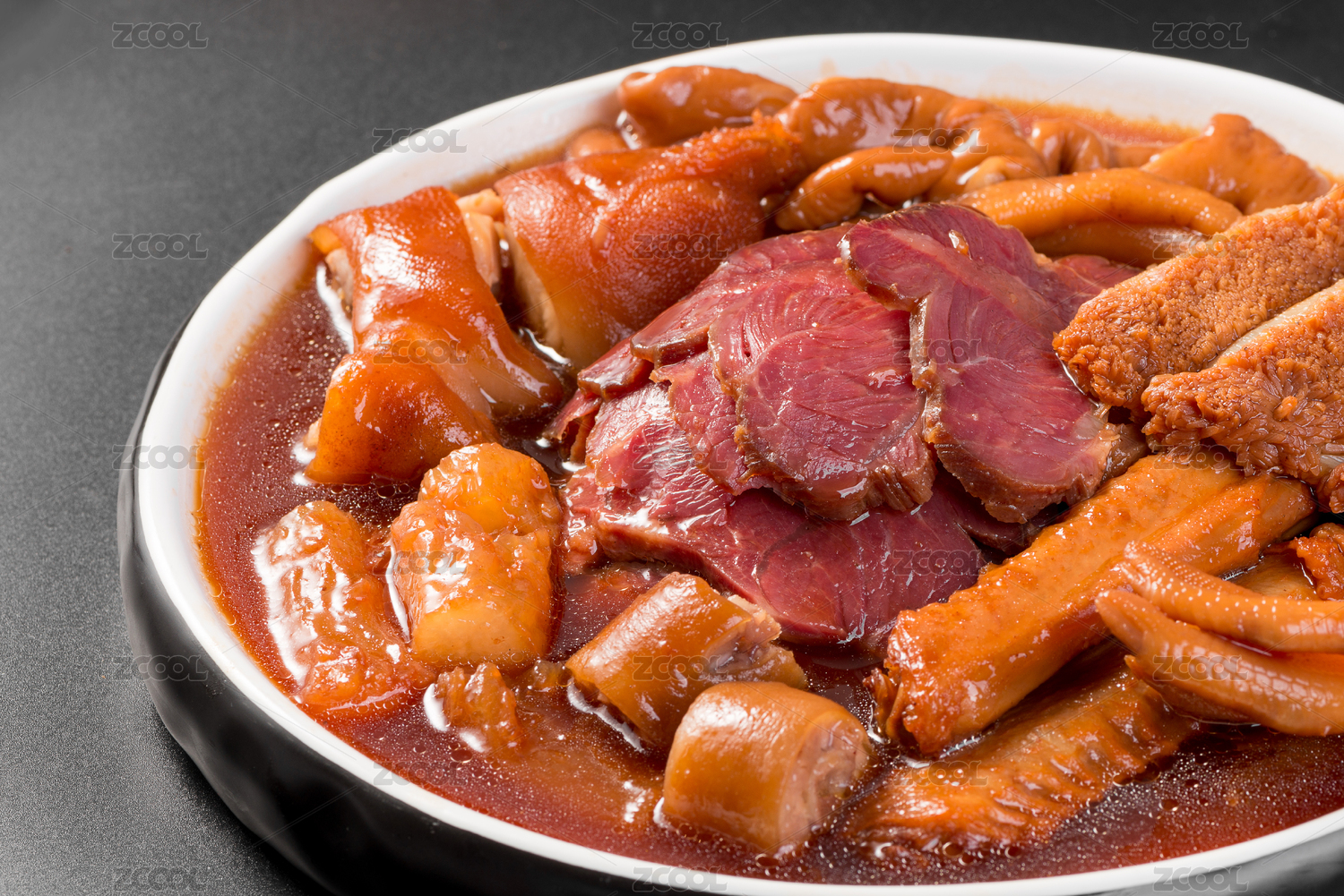 紅色背景上的一盤子鹵菜涼菜豬耳朵