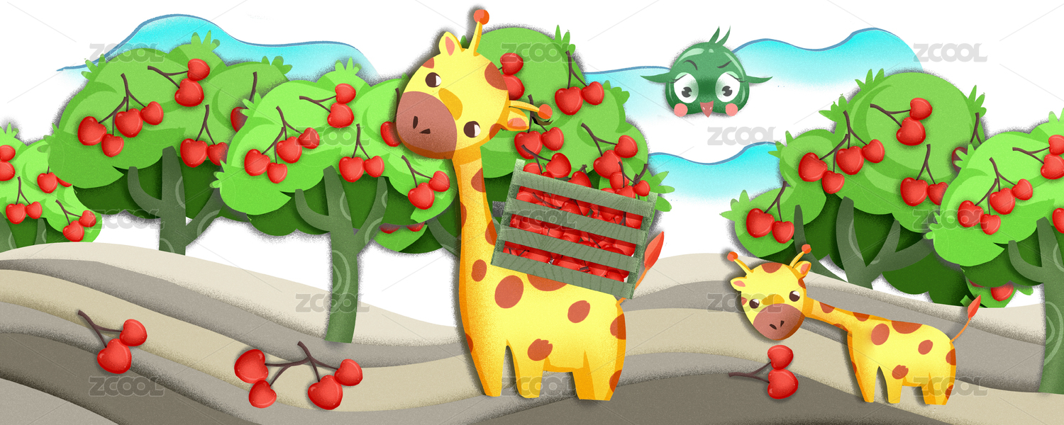 剪紙風(fēng)格可愛的長(zhǎng)頸鹿在果園收獲櫻桃插畫