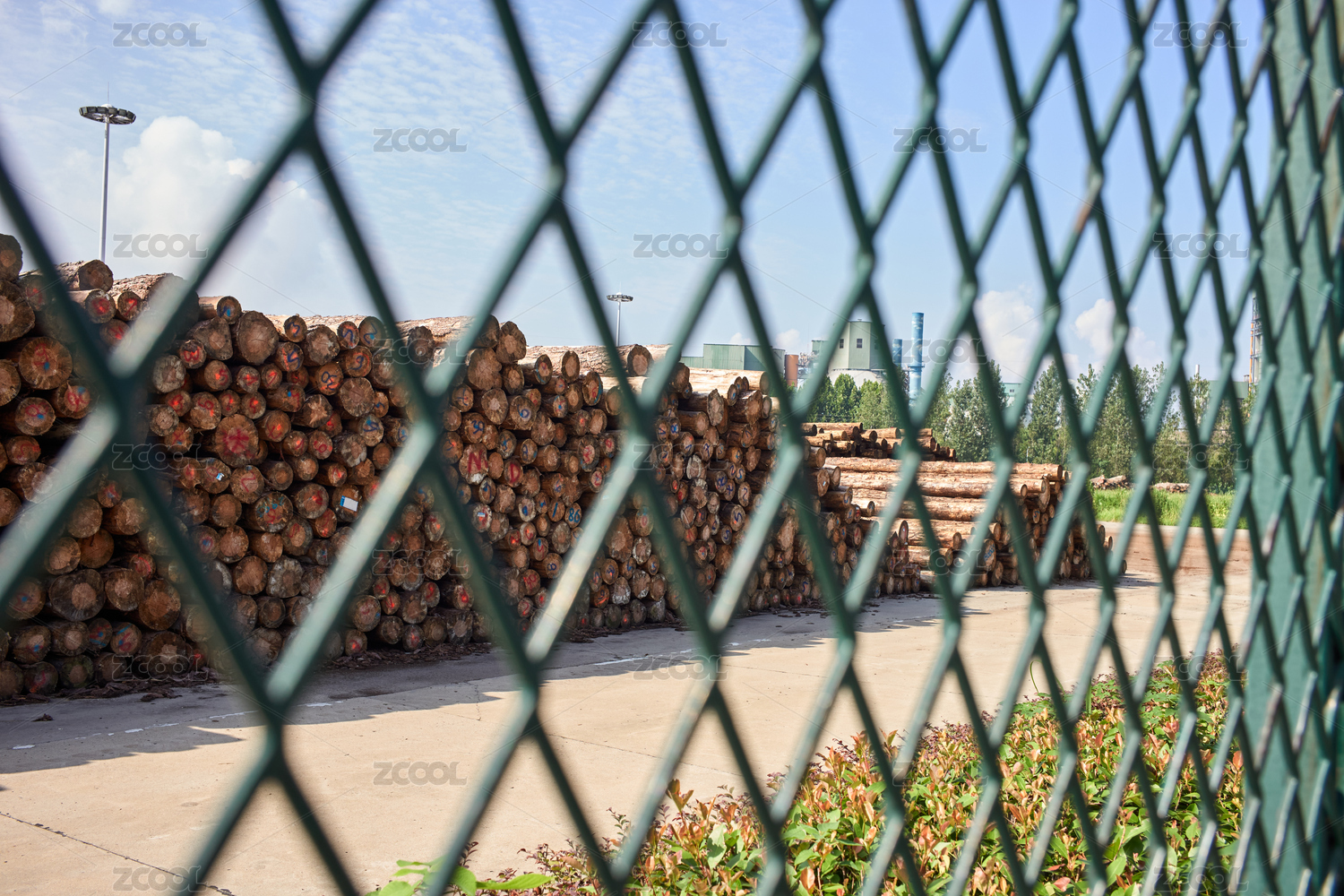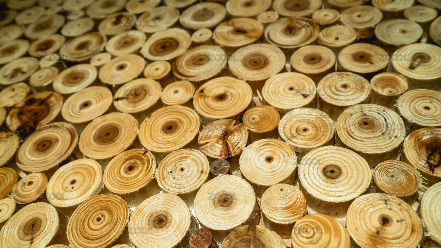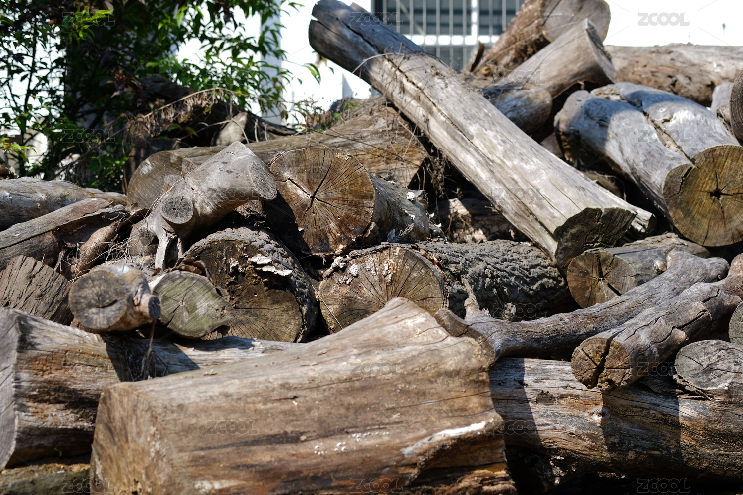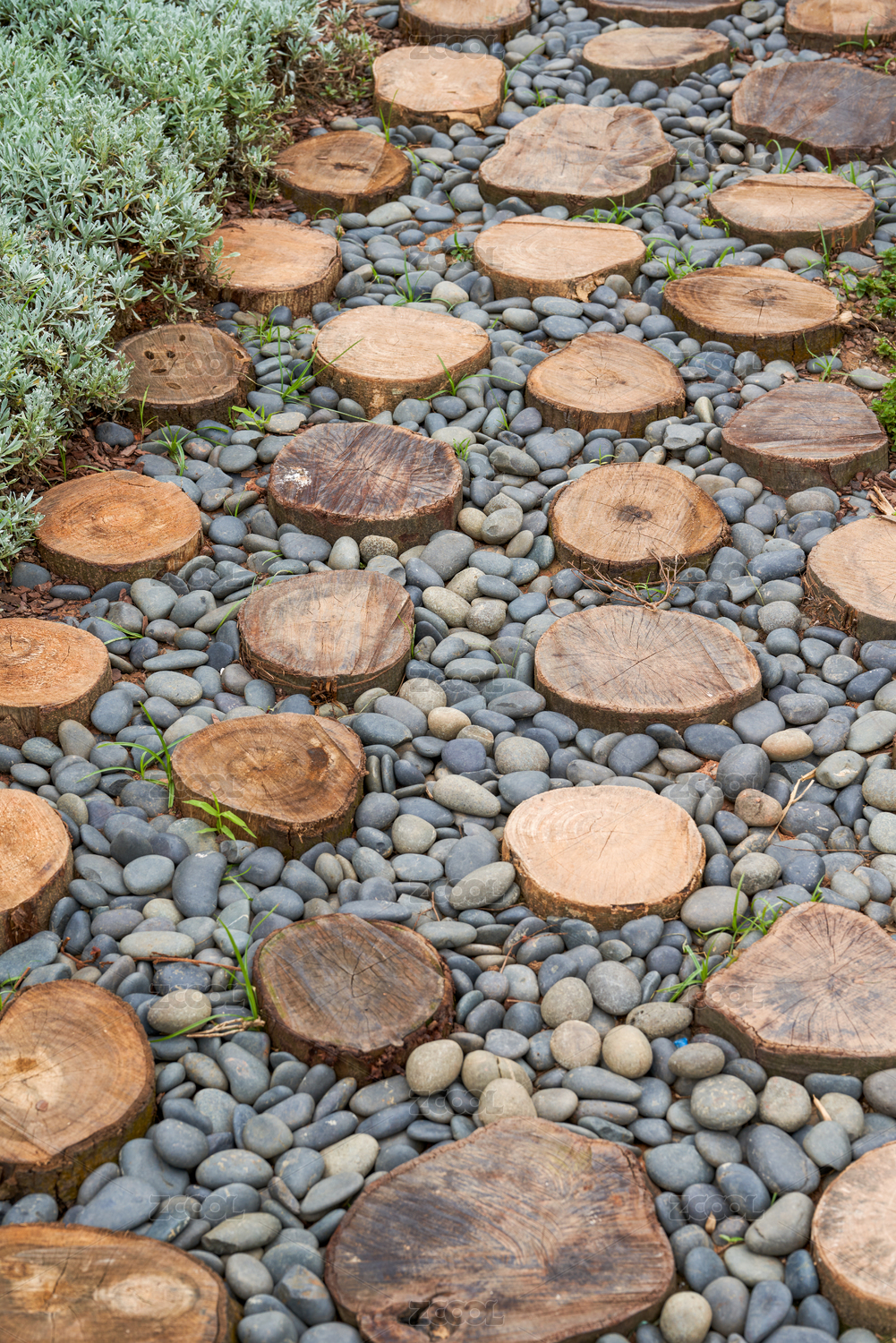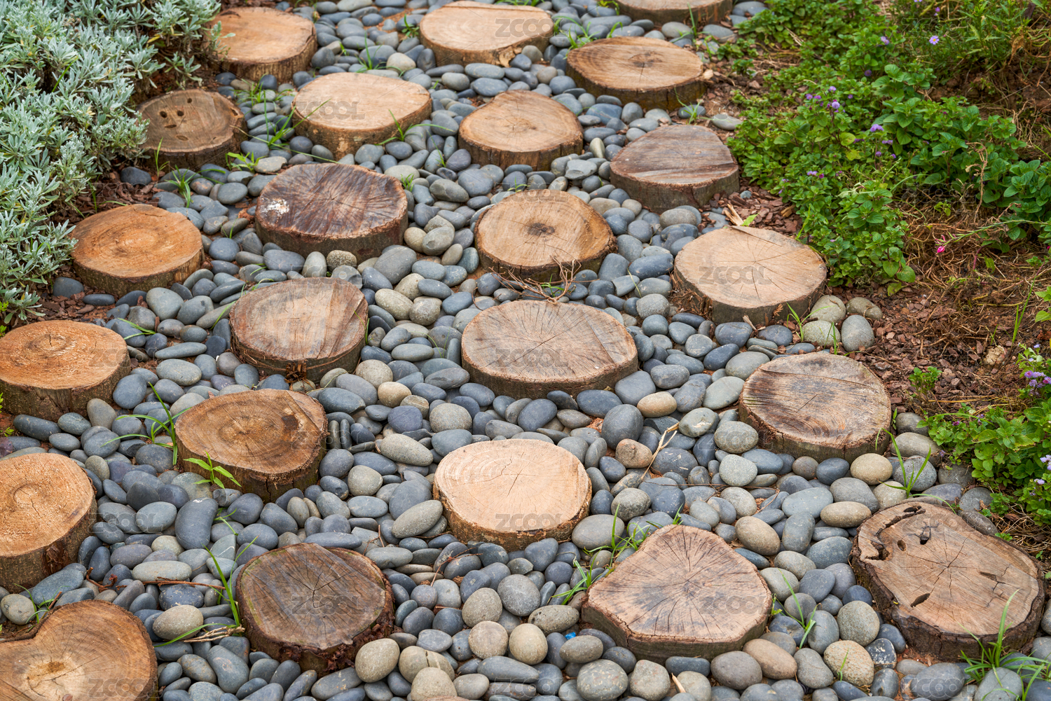 園林花園里用原木和鵝卵石堆砌組成的步道