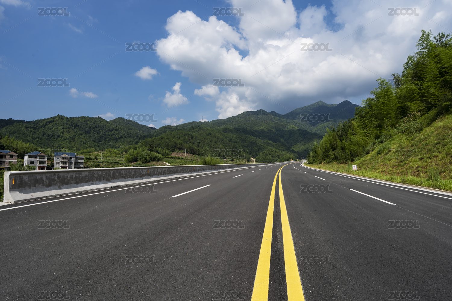 晴好天氣下古田近郊一條新建的鋪著柏油路面的通往山巒間的快速通道,中國福建上杭古田