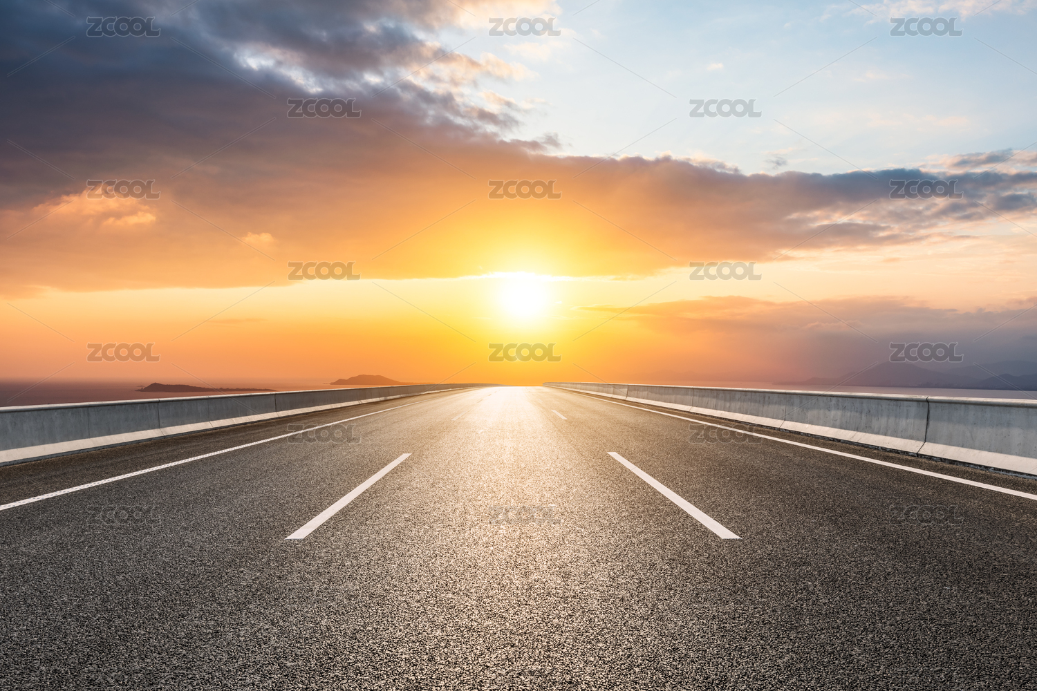 日出時海邊景色和瀝青路