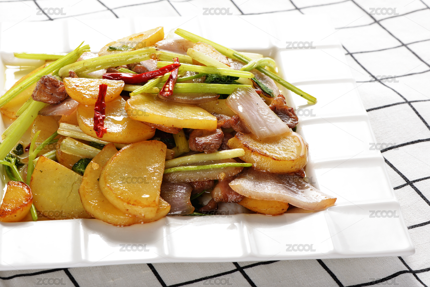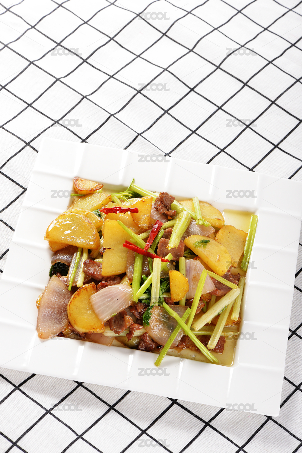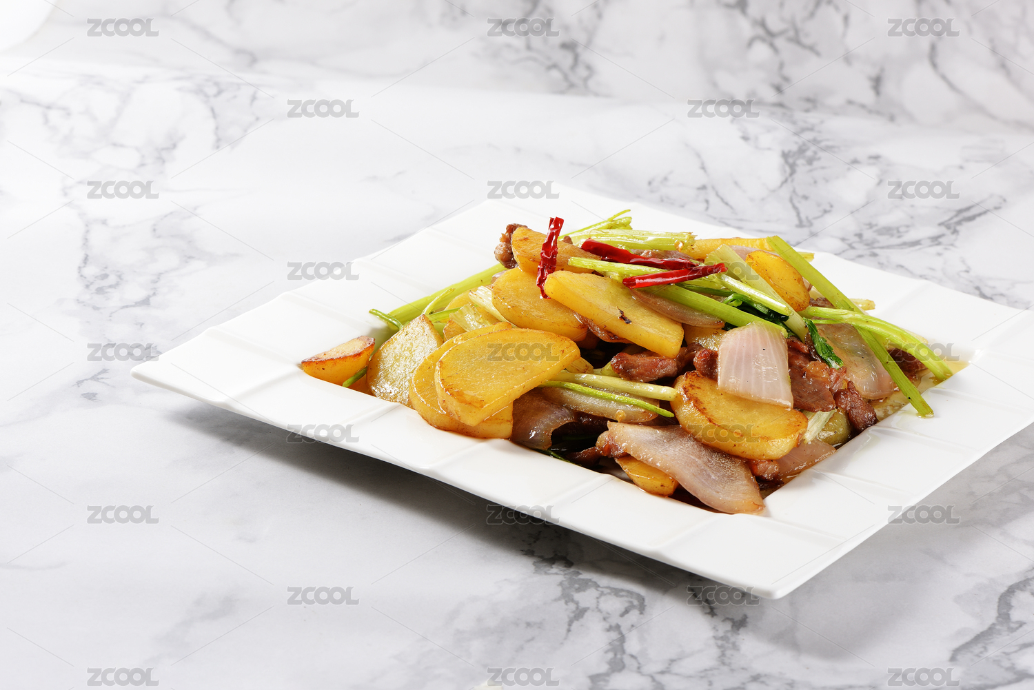 一碟煮熟的過油肉土豆片