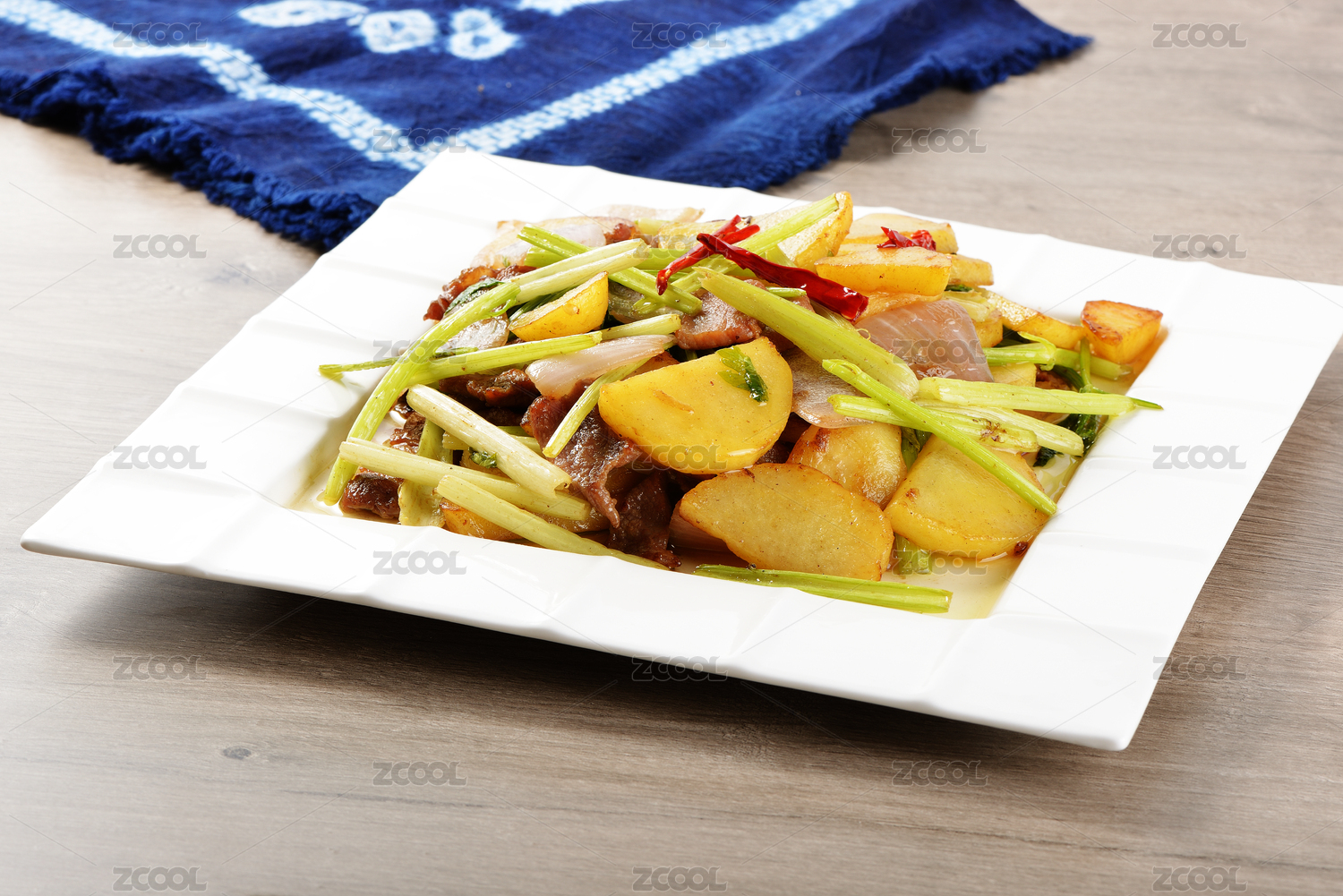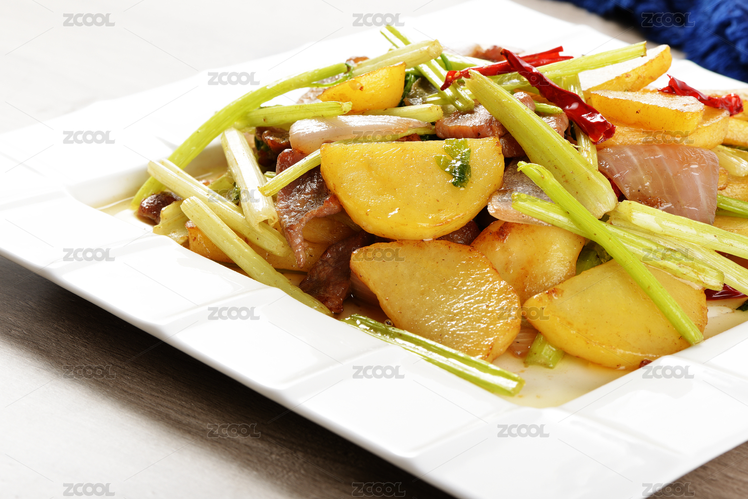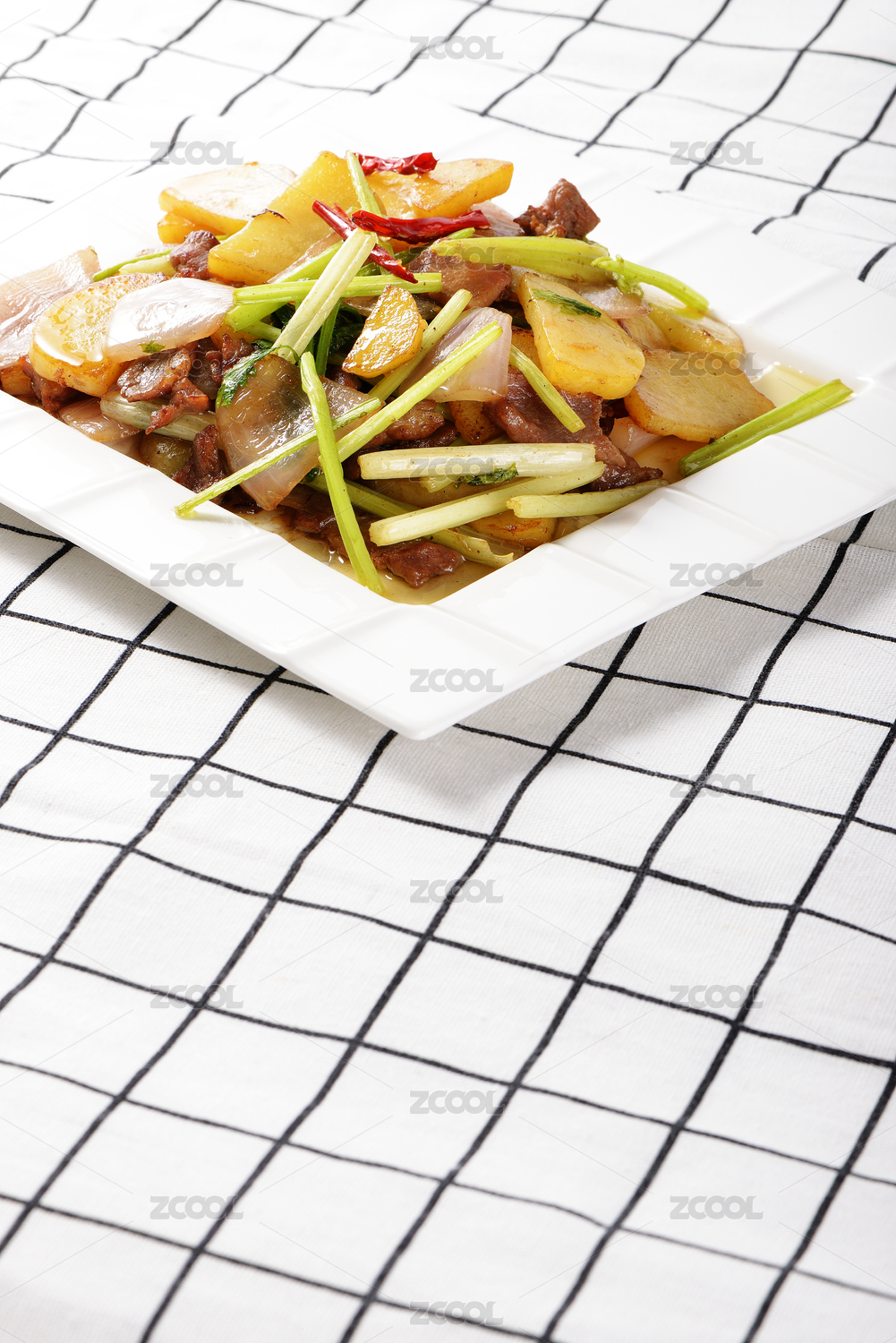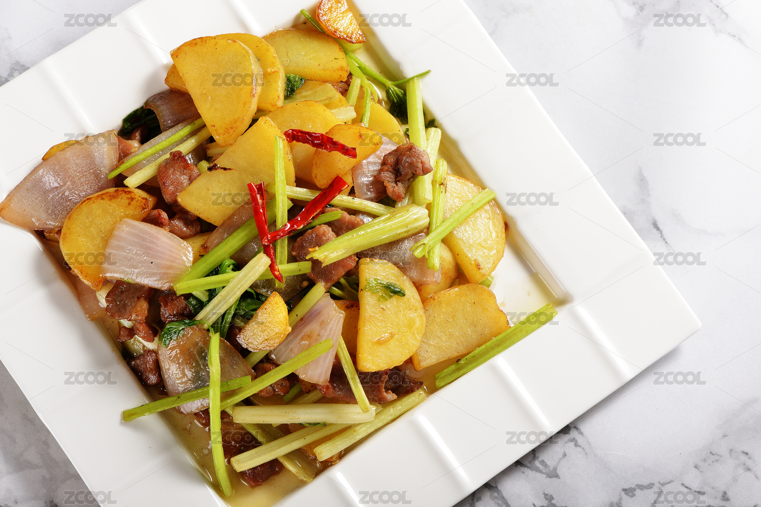 一碟煮熟的過油肉土豆片