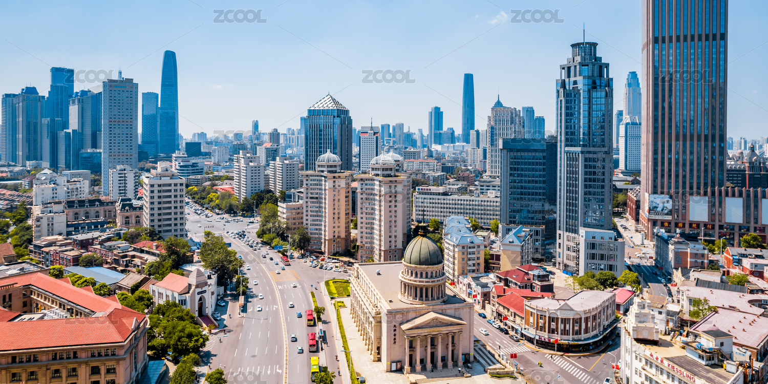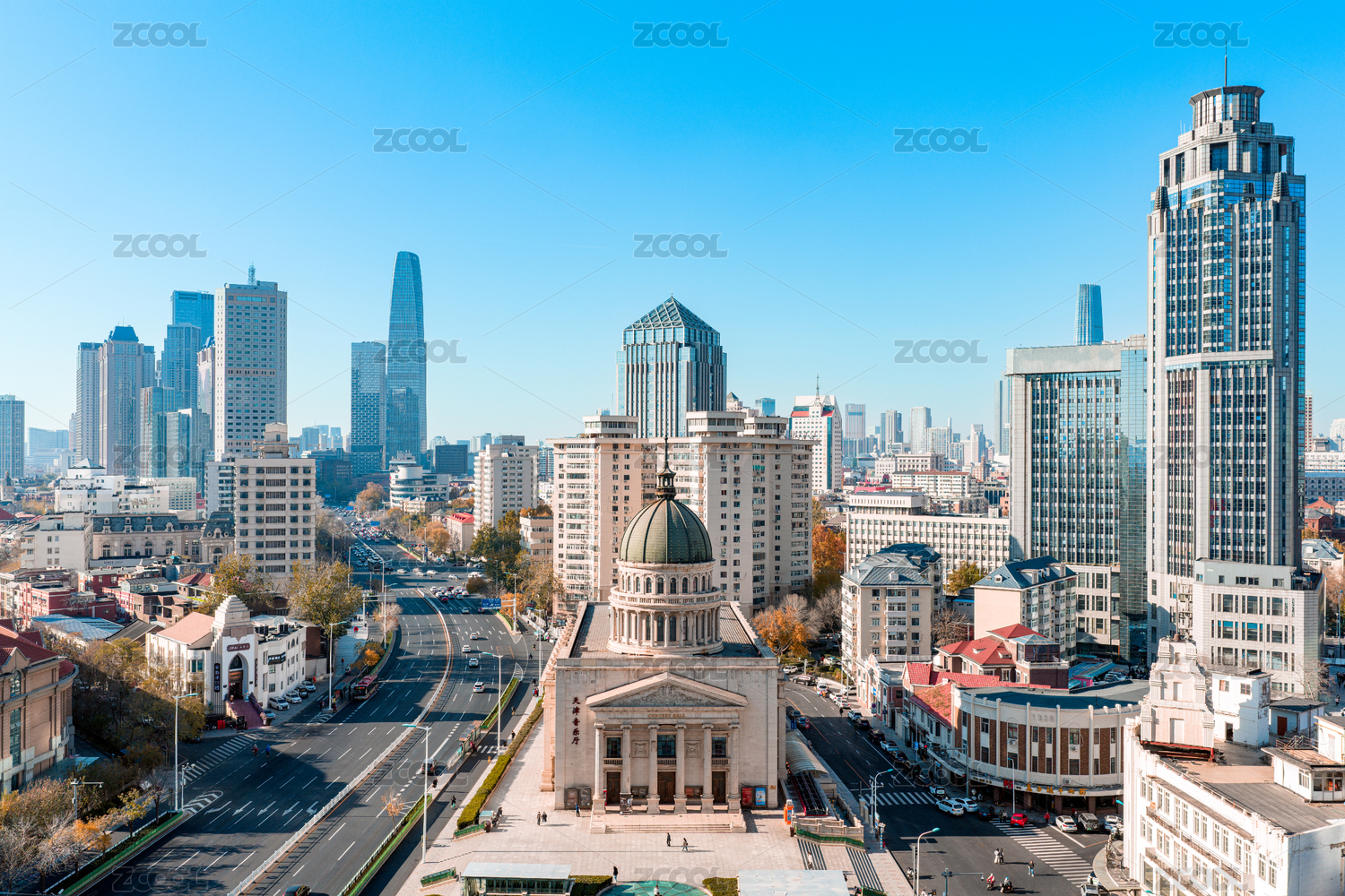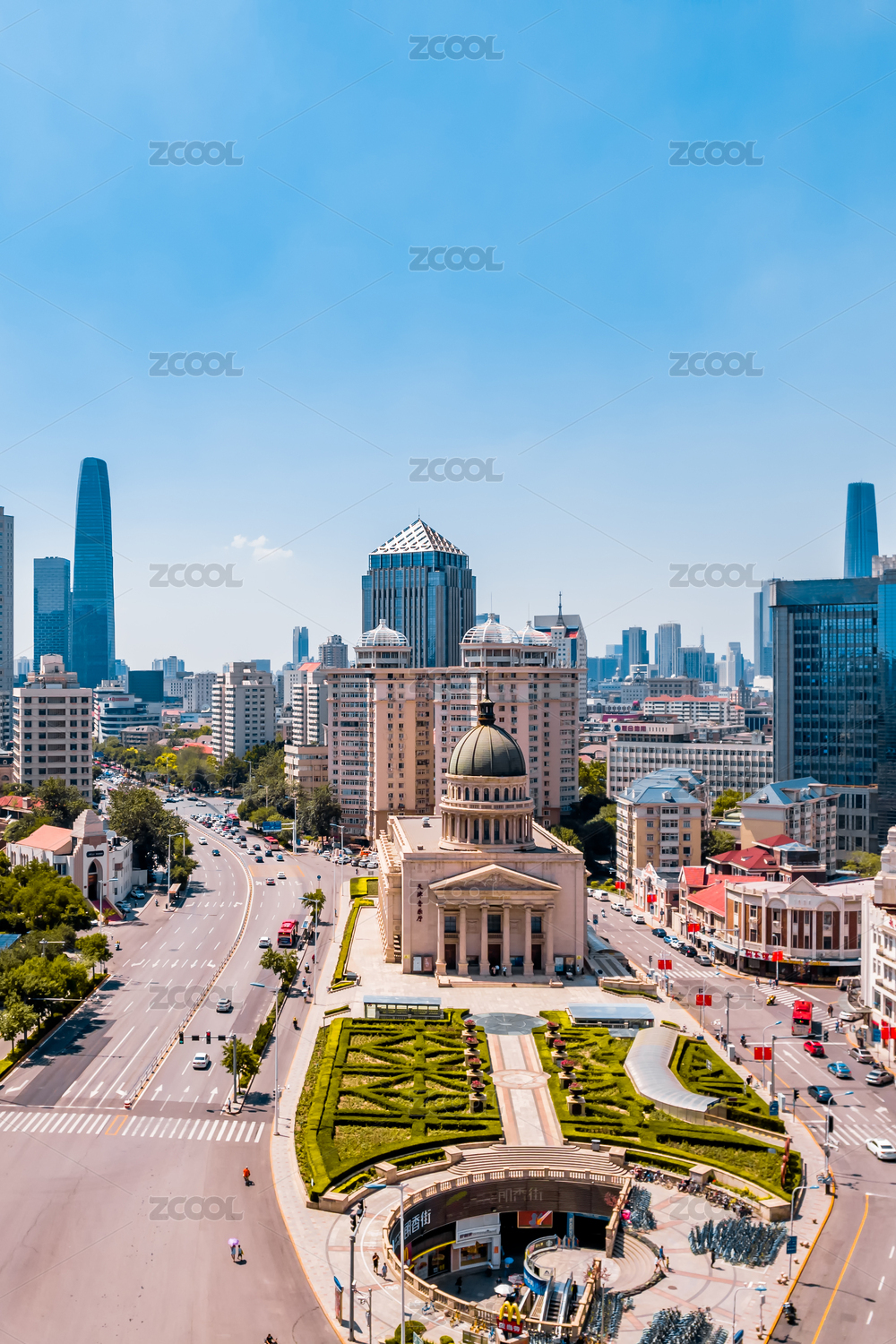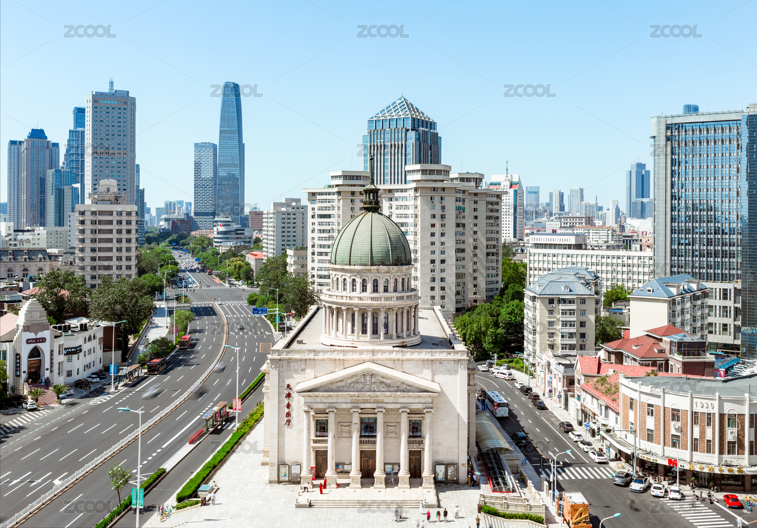 中國(guó)天津天津音樂(lè)廳小白樓和城市天際線航拍