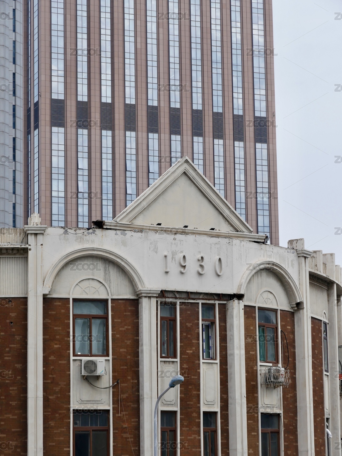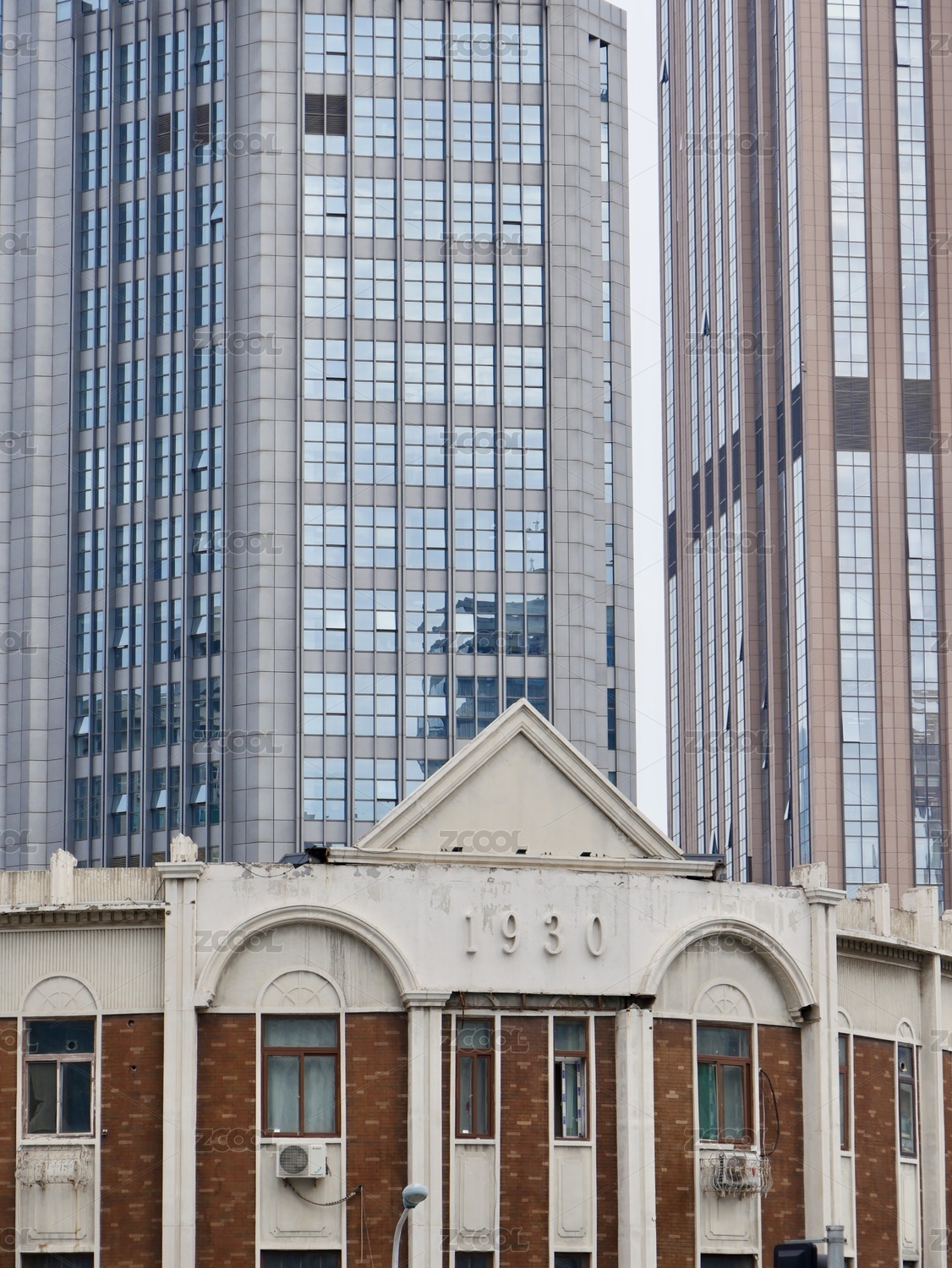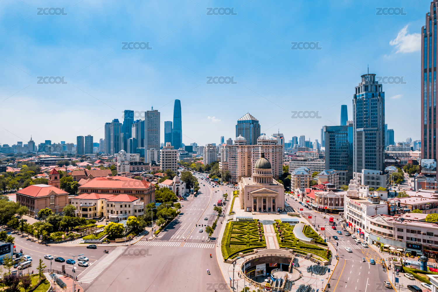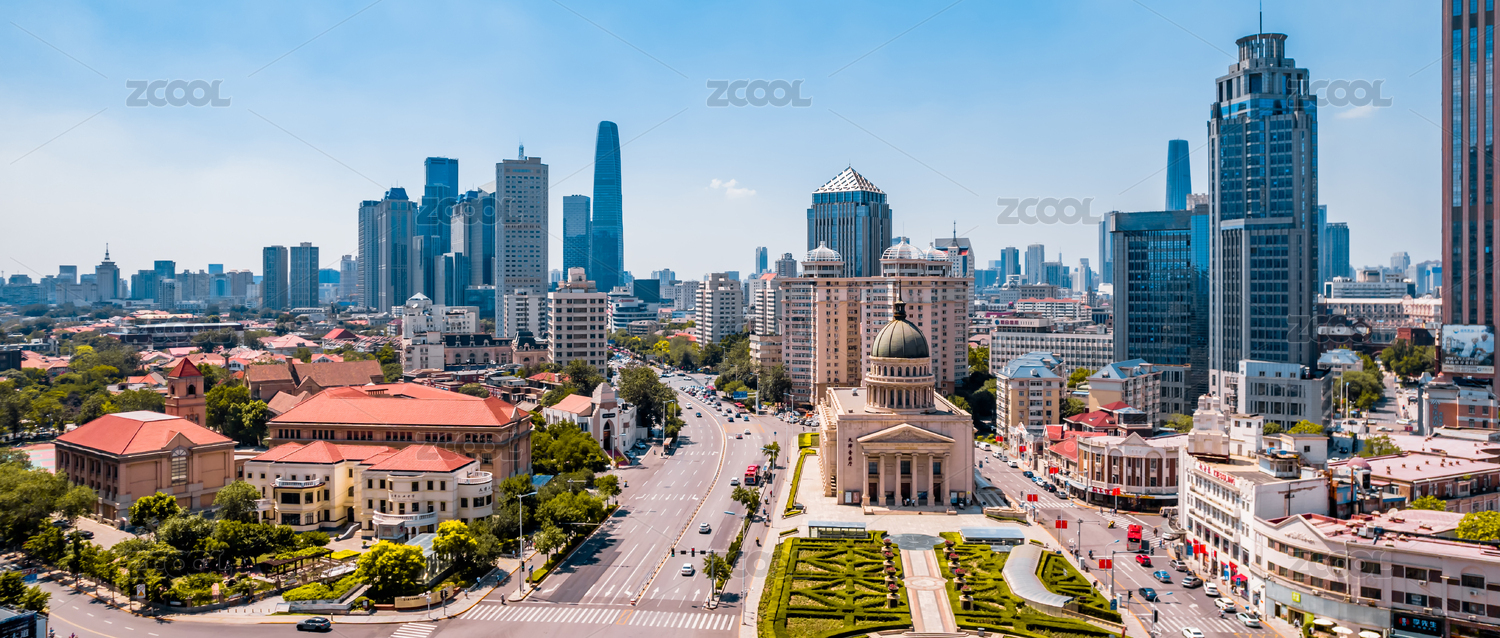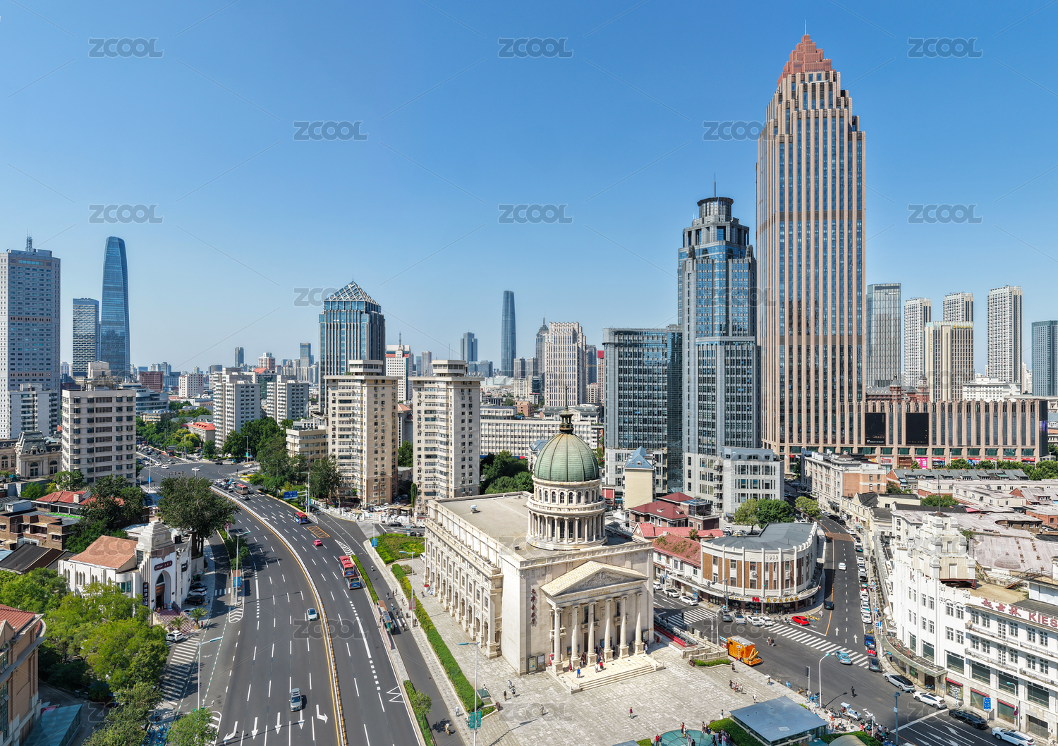 中國(guó)天津天津音樂(lè)廳小白樓和城市天際線航拍
