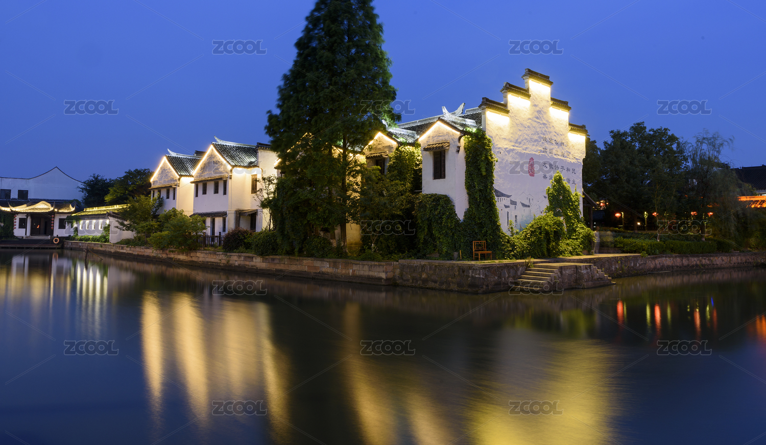 中國浙江杭州西塘古鎮(zhèn)河面倒影映襯古樸建筑夜景