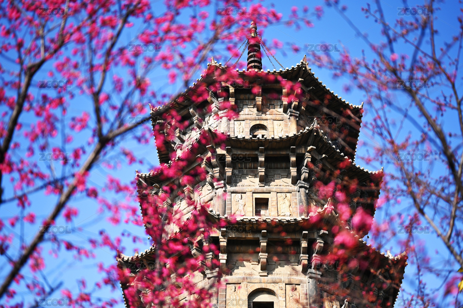 春天鮮艷櫻花映襯下的福建泉州開元寺東塔