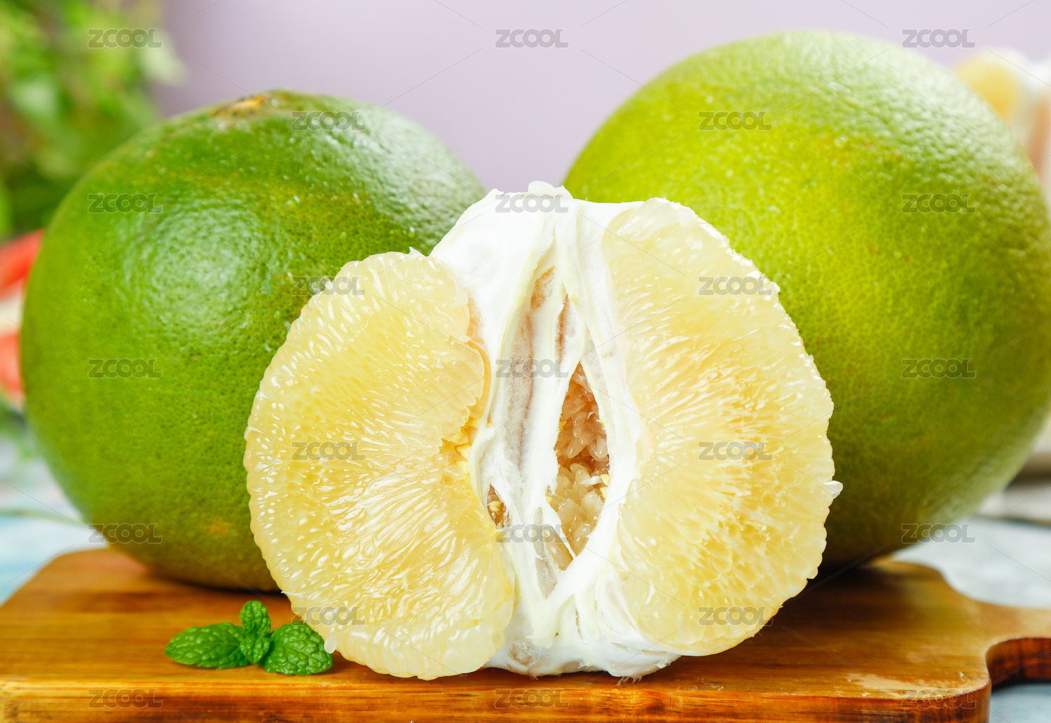 木板上放著兩個完整的泰國金柚和半邊青柚