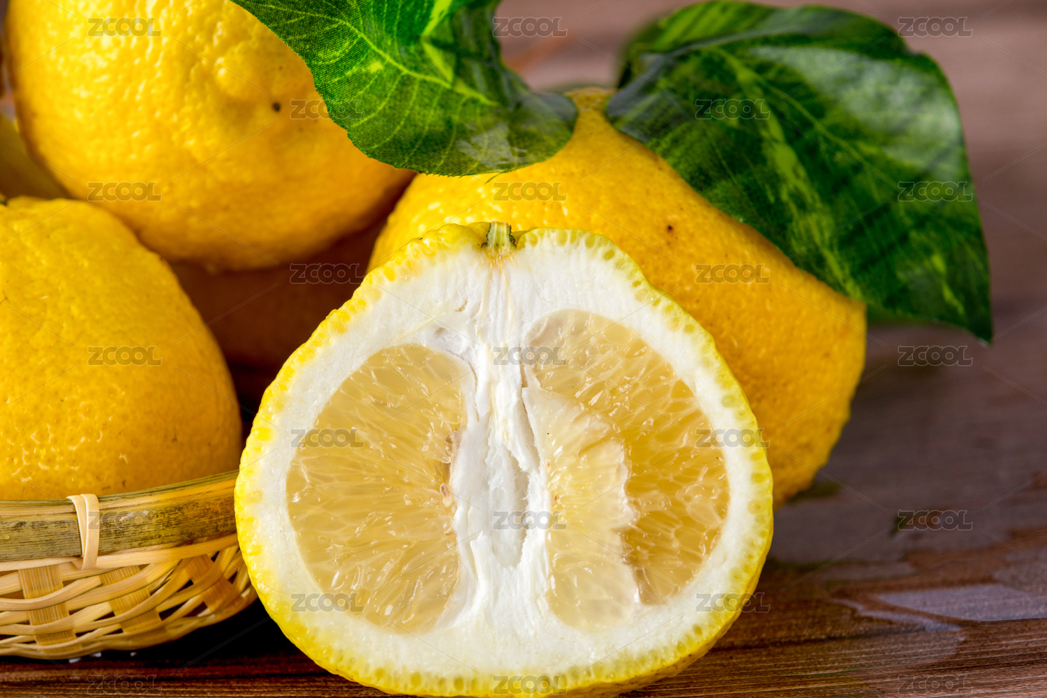 金柚和剝開果肉帶綠葉子放鋪麻布木板上
