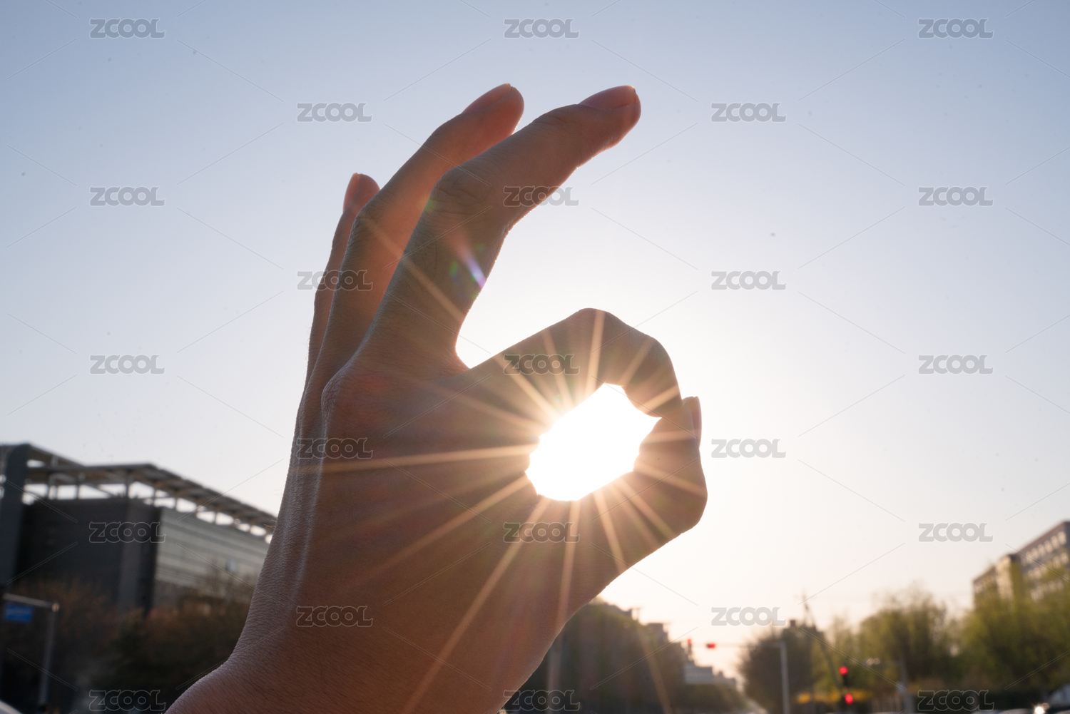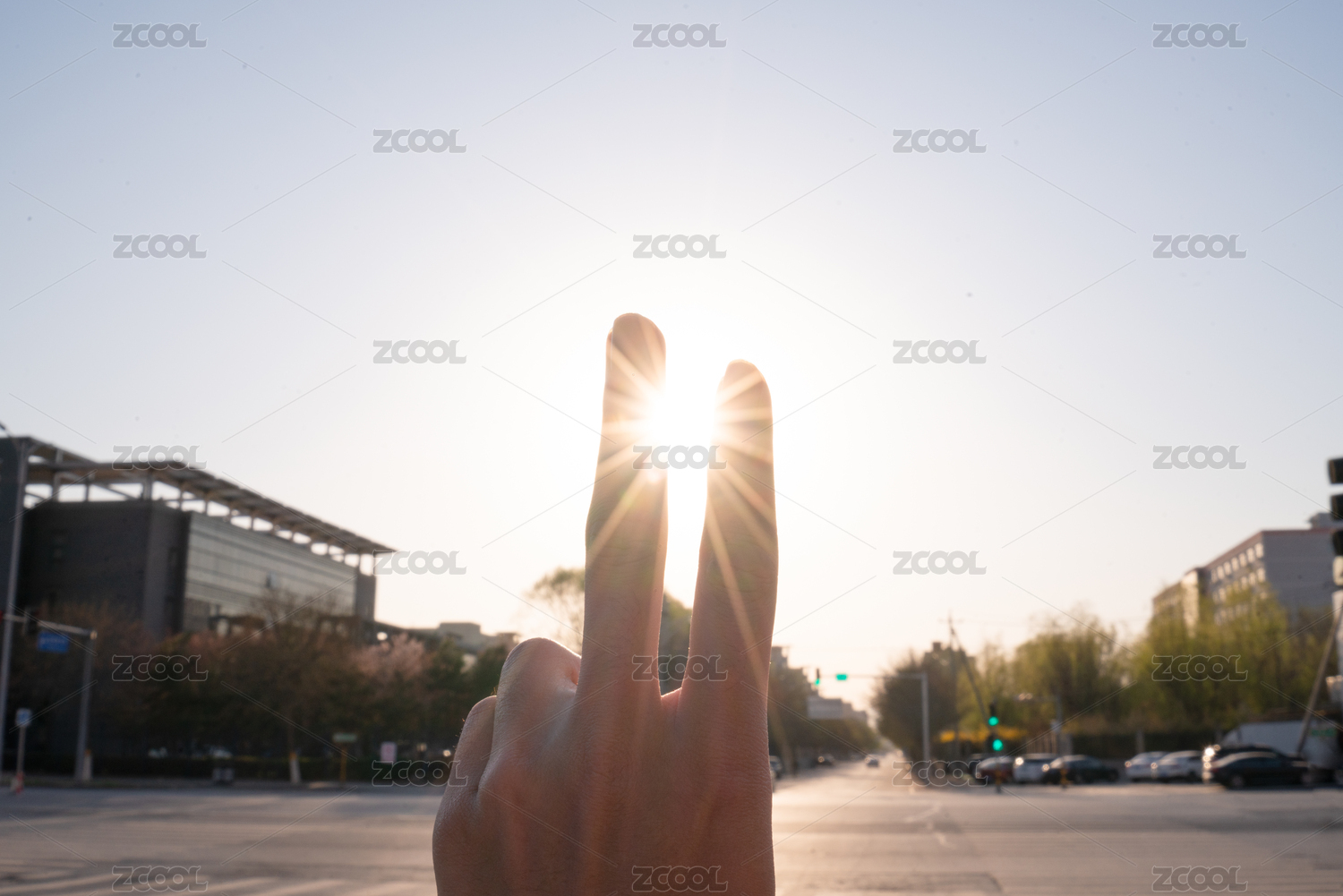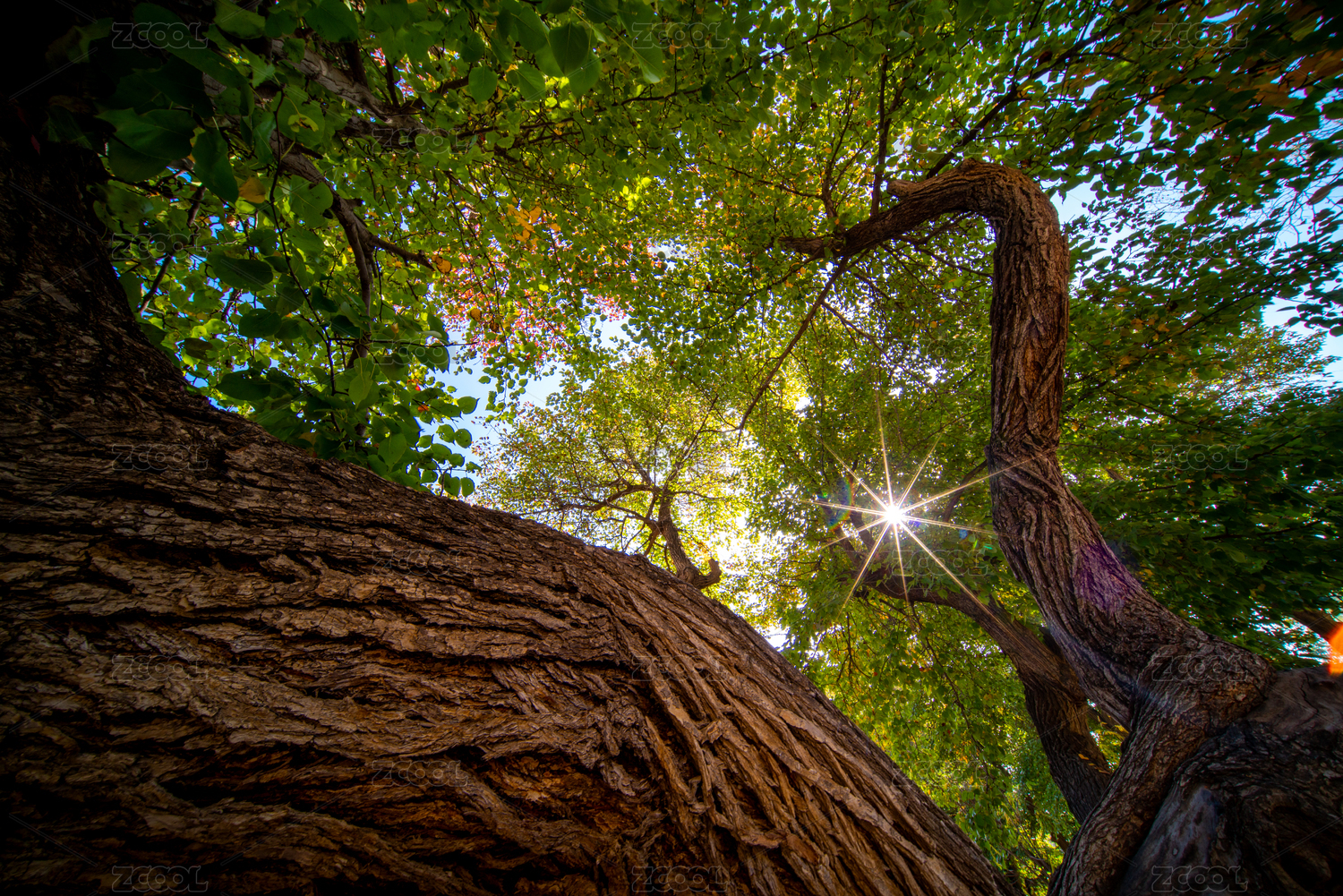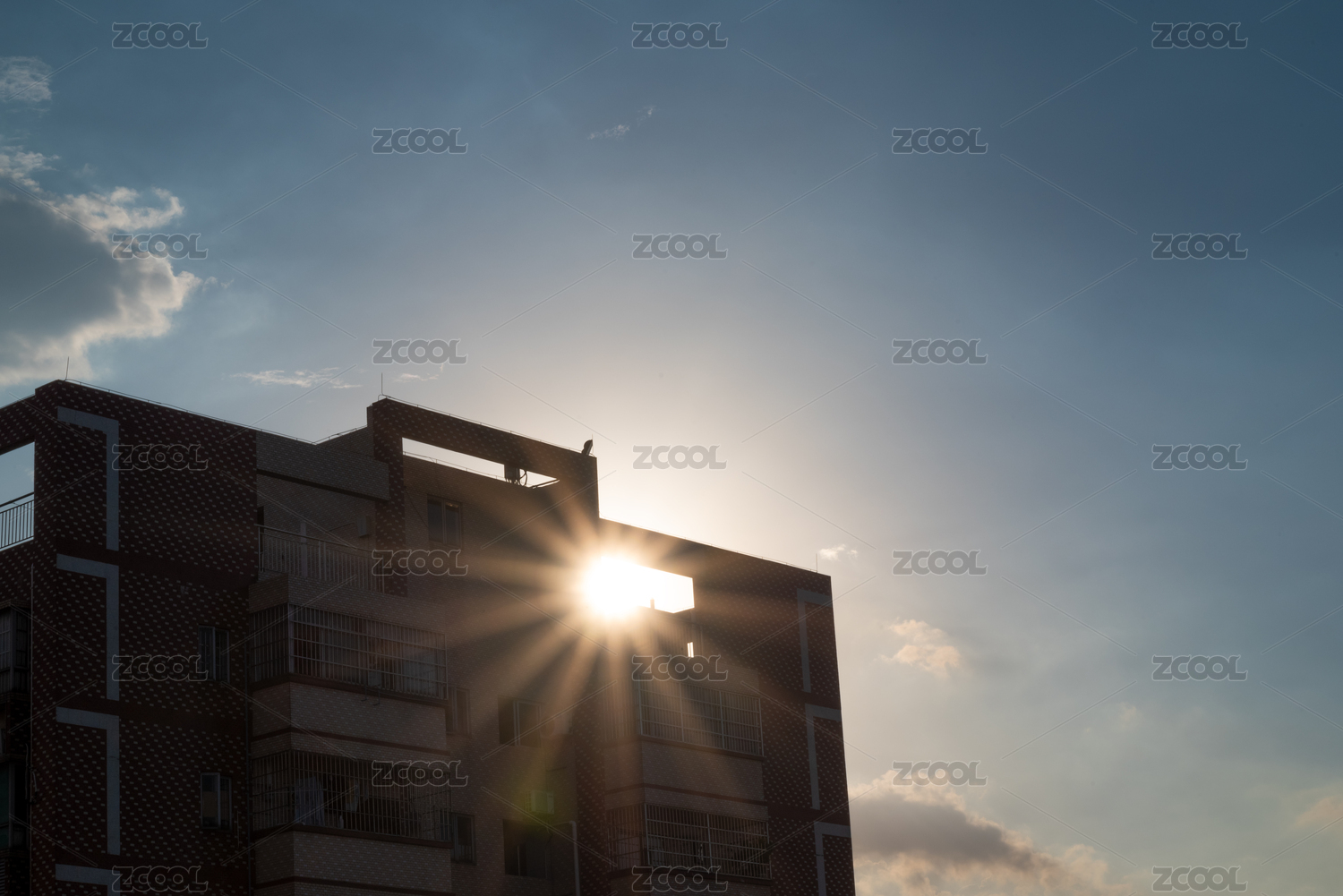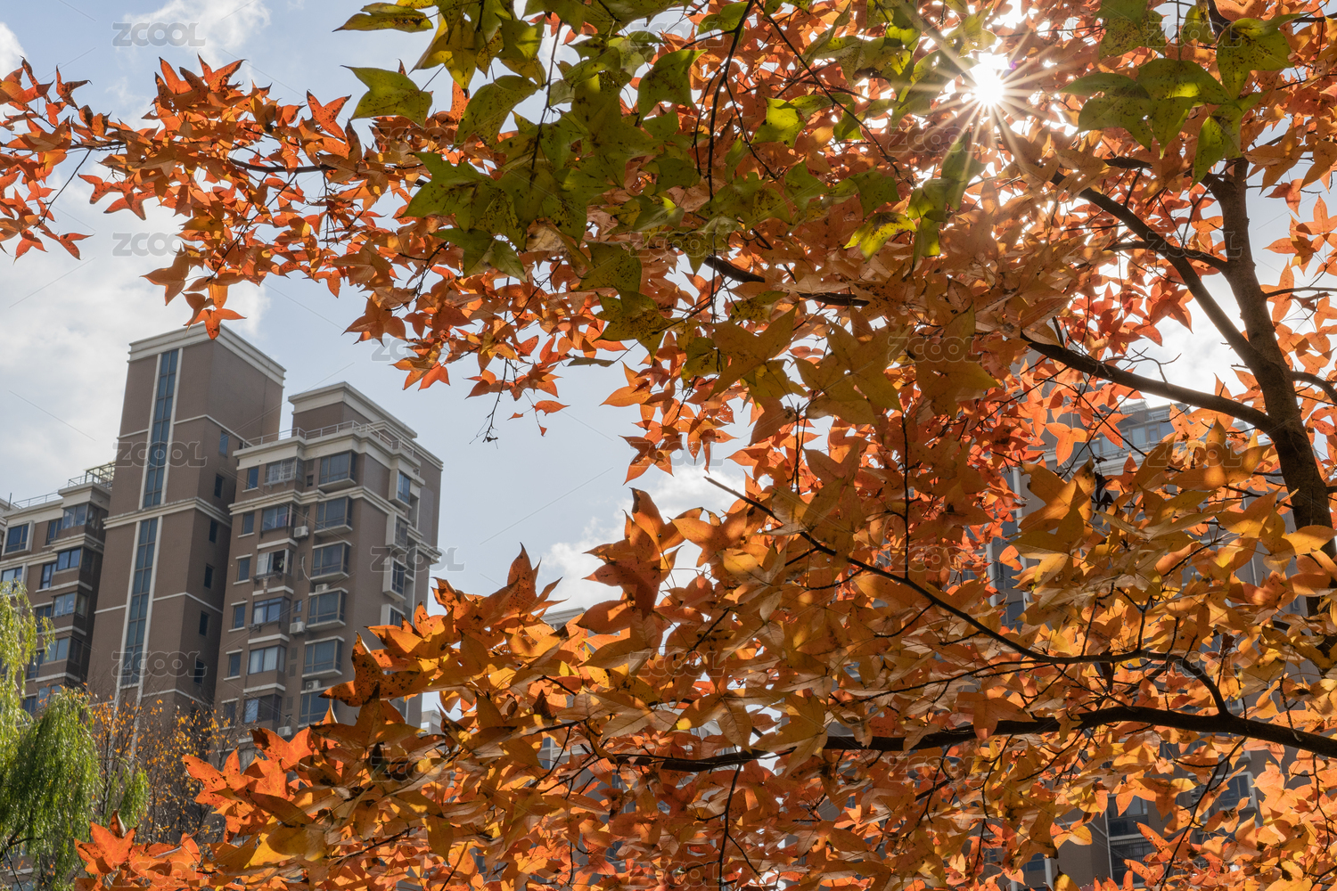 逆光下的楓香秋葉星芒和小區(qū)建筑