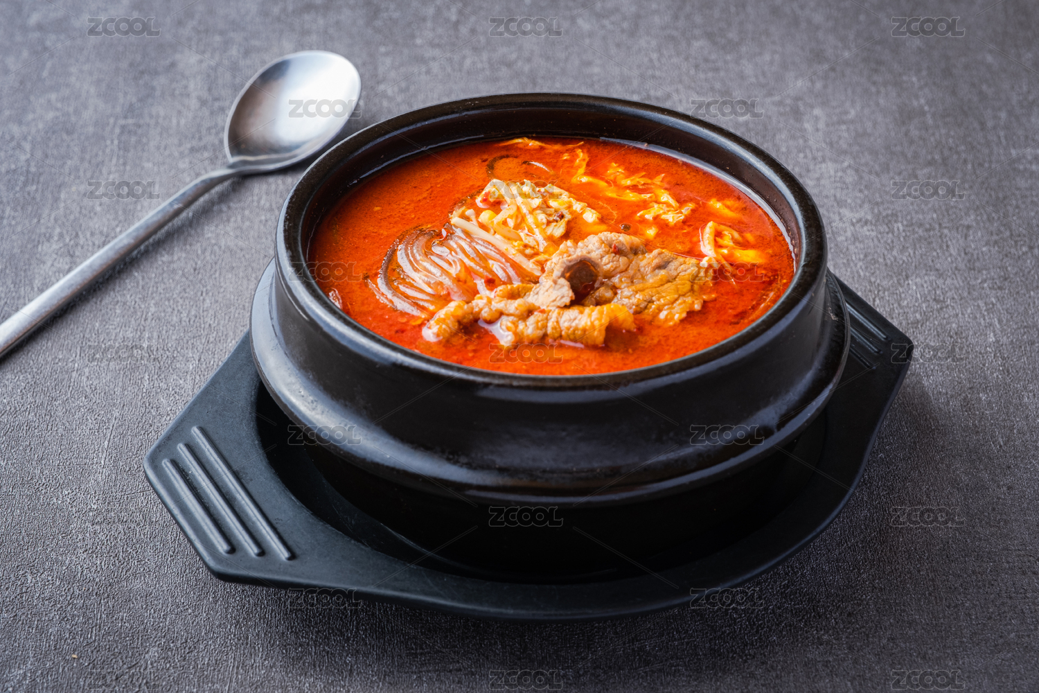 黑底上放著一碗花甲粉絲湯和勺子上挖著花甲