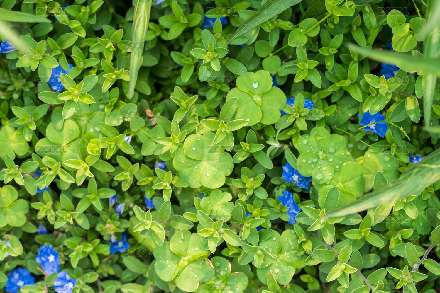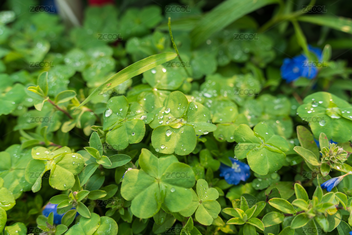 帶水珠的三葉草與藍色小花