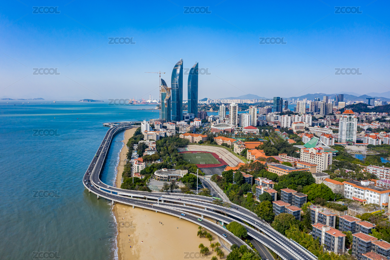 航拍中國福建廈門演武大橋白城沙灘世茂海峽大廈