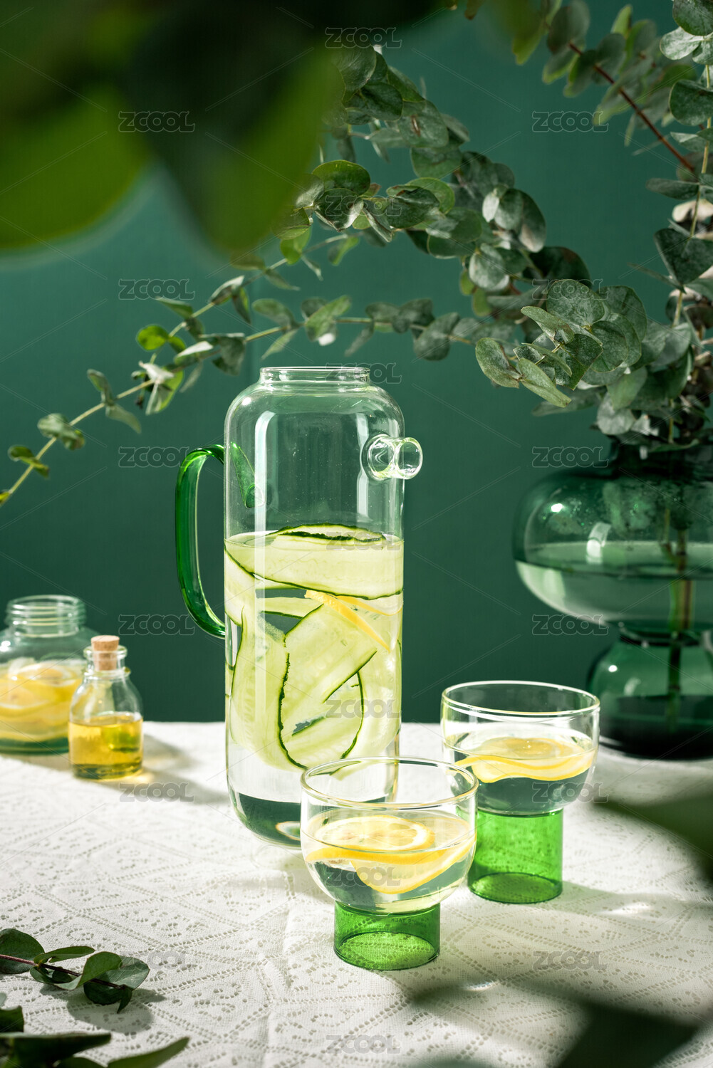 綠墻前放著用玻璃壺裝著的青瓜檸檬水