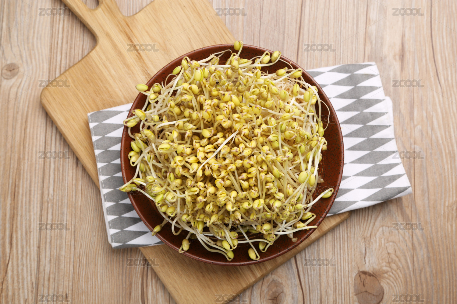 一碗黃豆芽擺放在木桌面上特寫