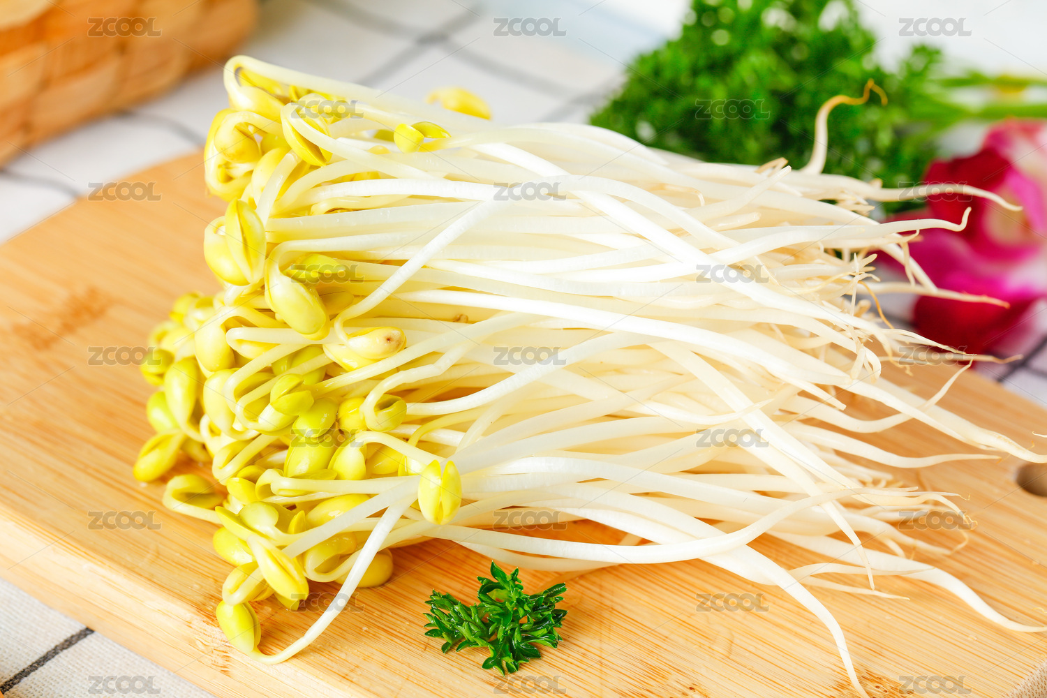 新鮮的黃豆芽擺放在桌面上
