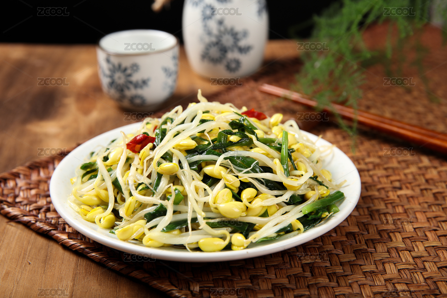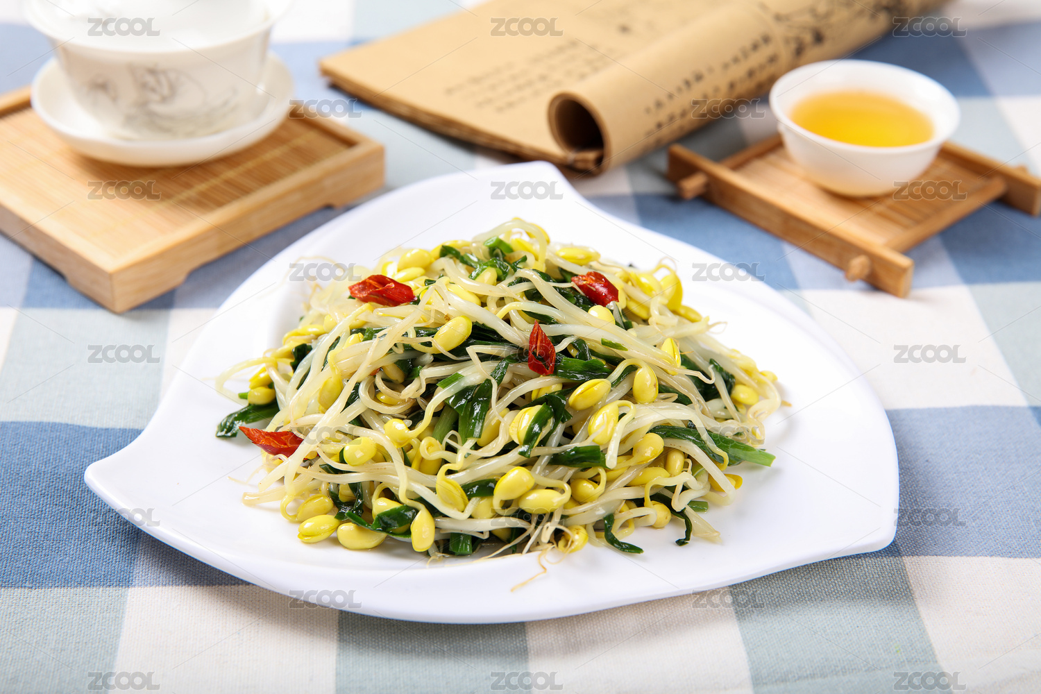白底上放著一盤黃豆芽