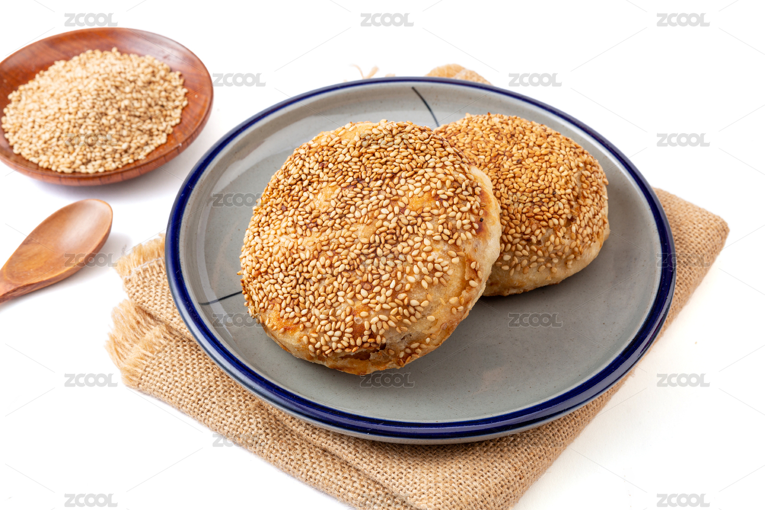 一盤(pán)芝麻燒餅特寫(xiě)白色背景