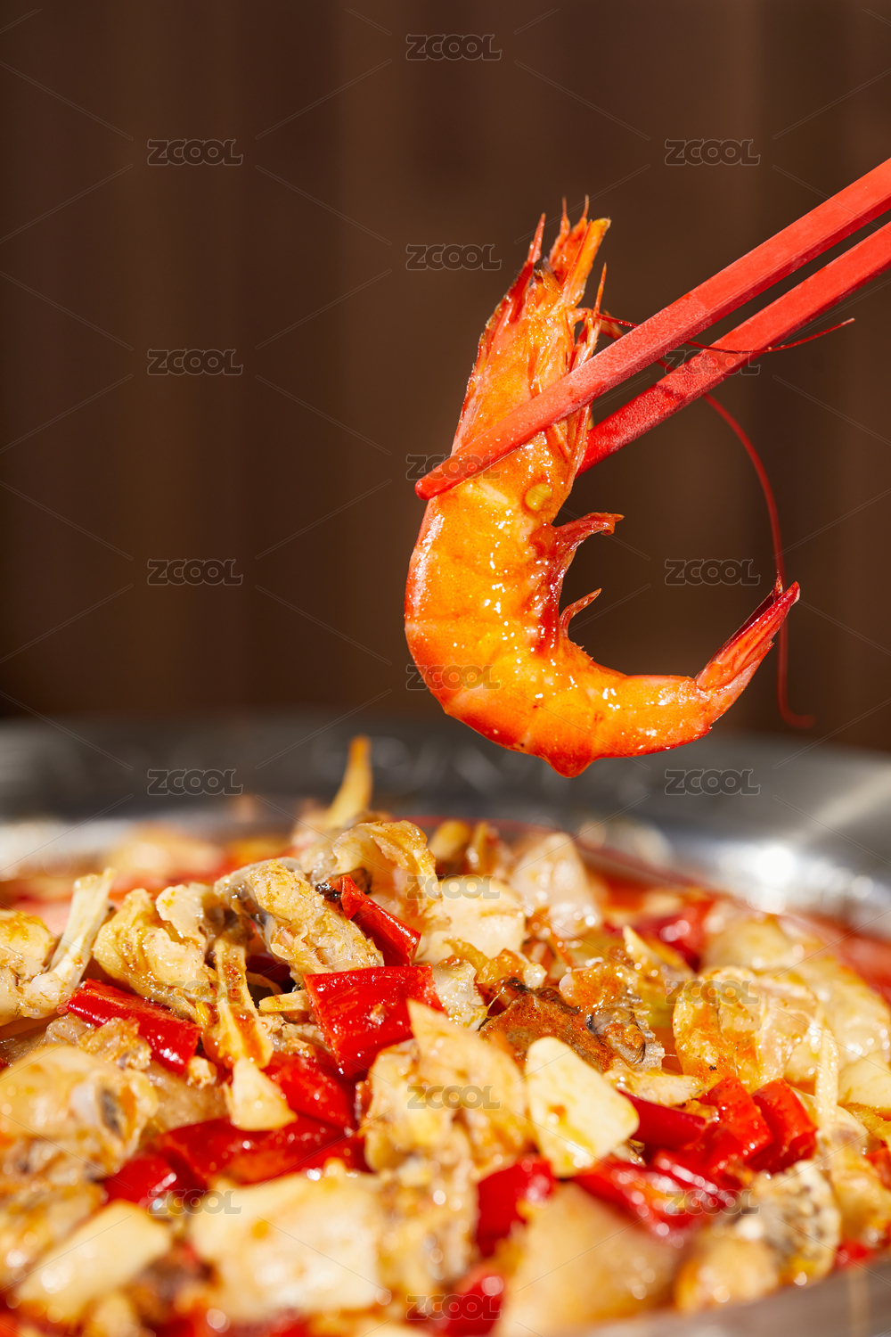 用筷子從蝦煲中夾起一只大蝦