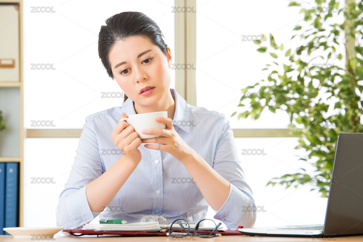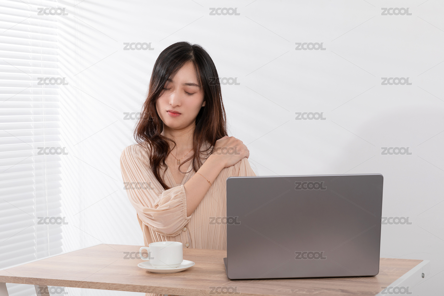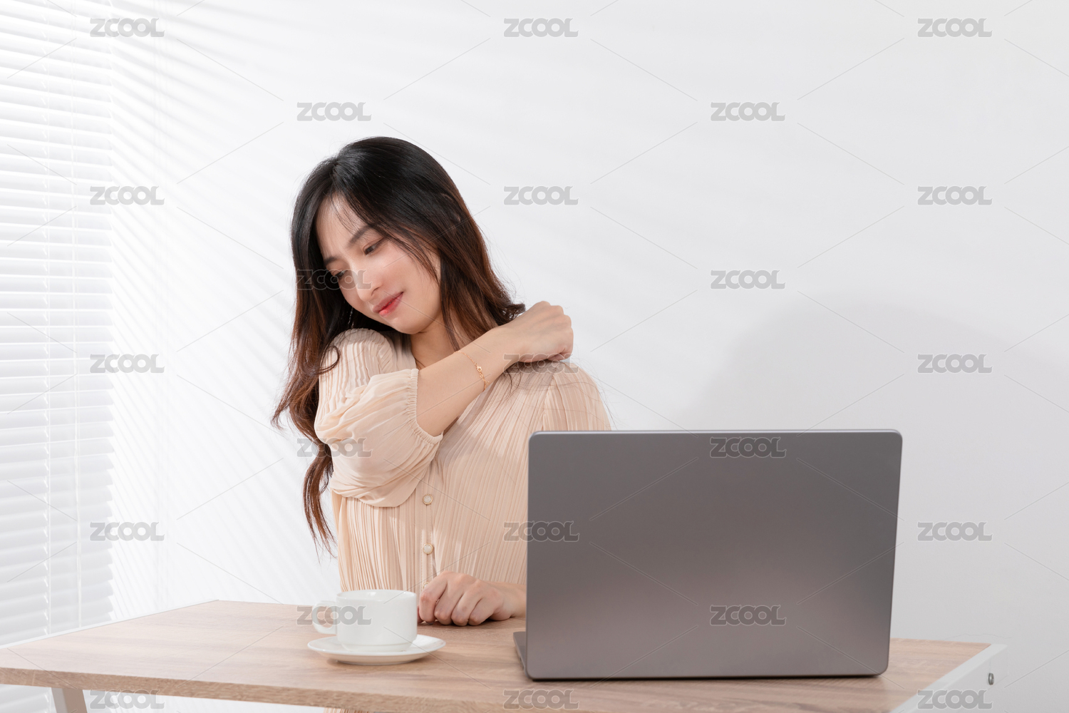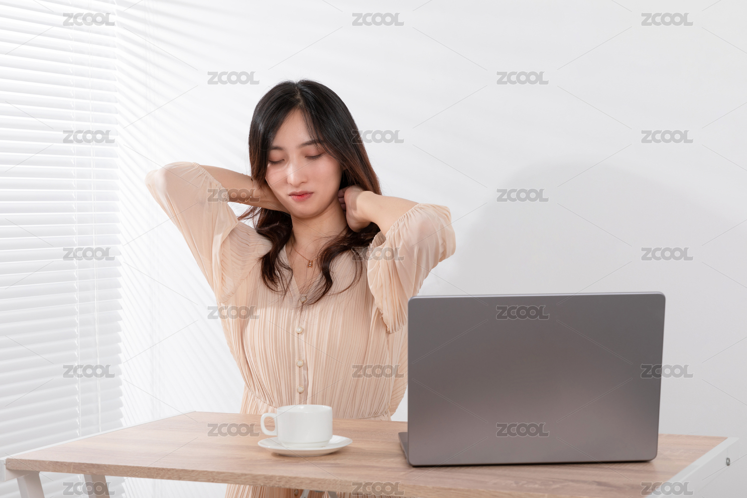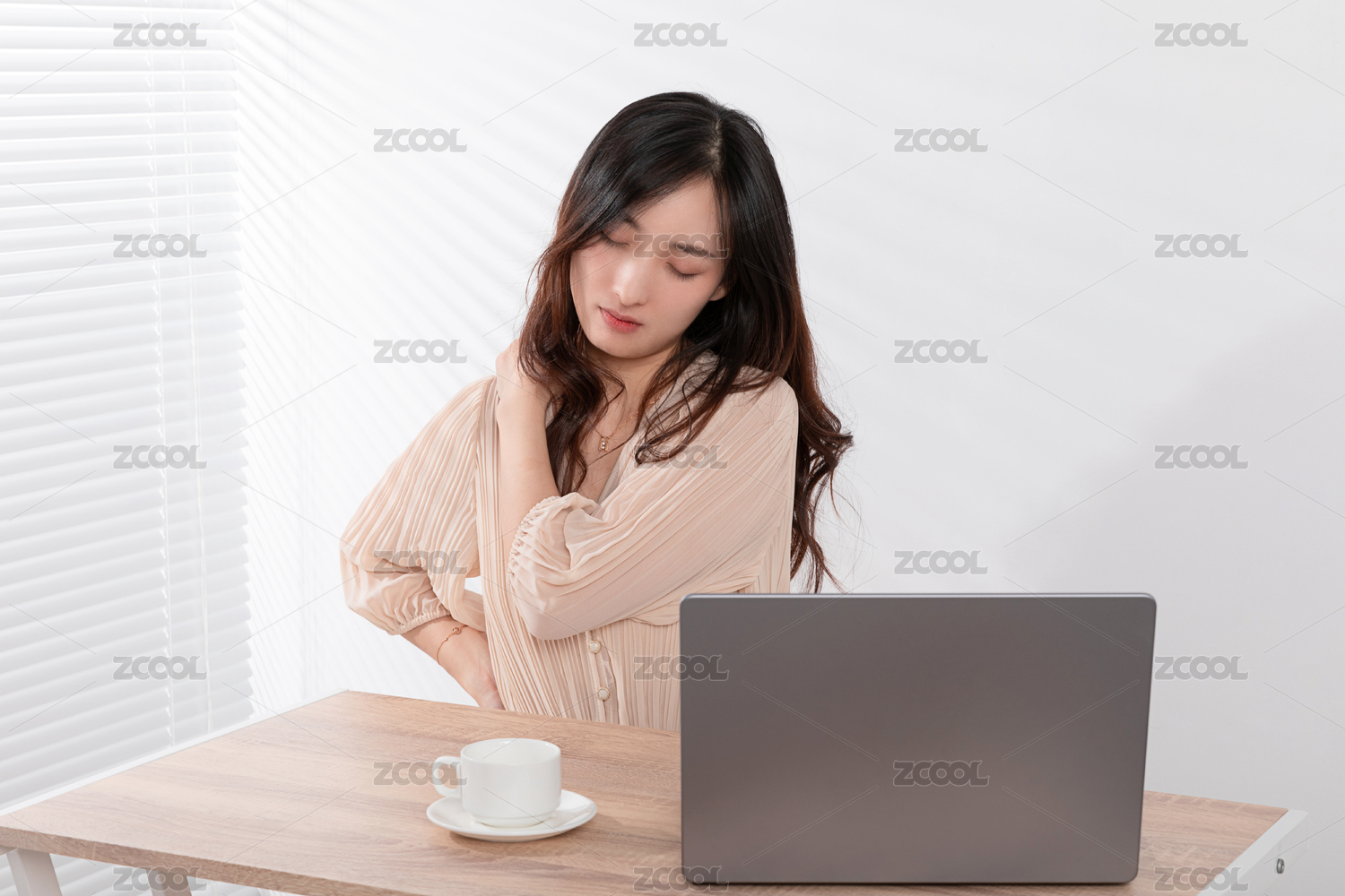 百葉窗旁在電腦前非常勞累的美女