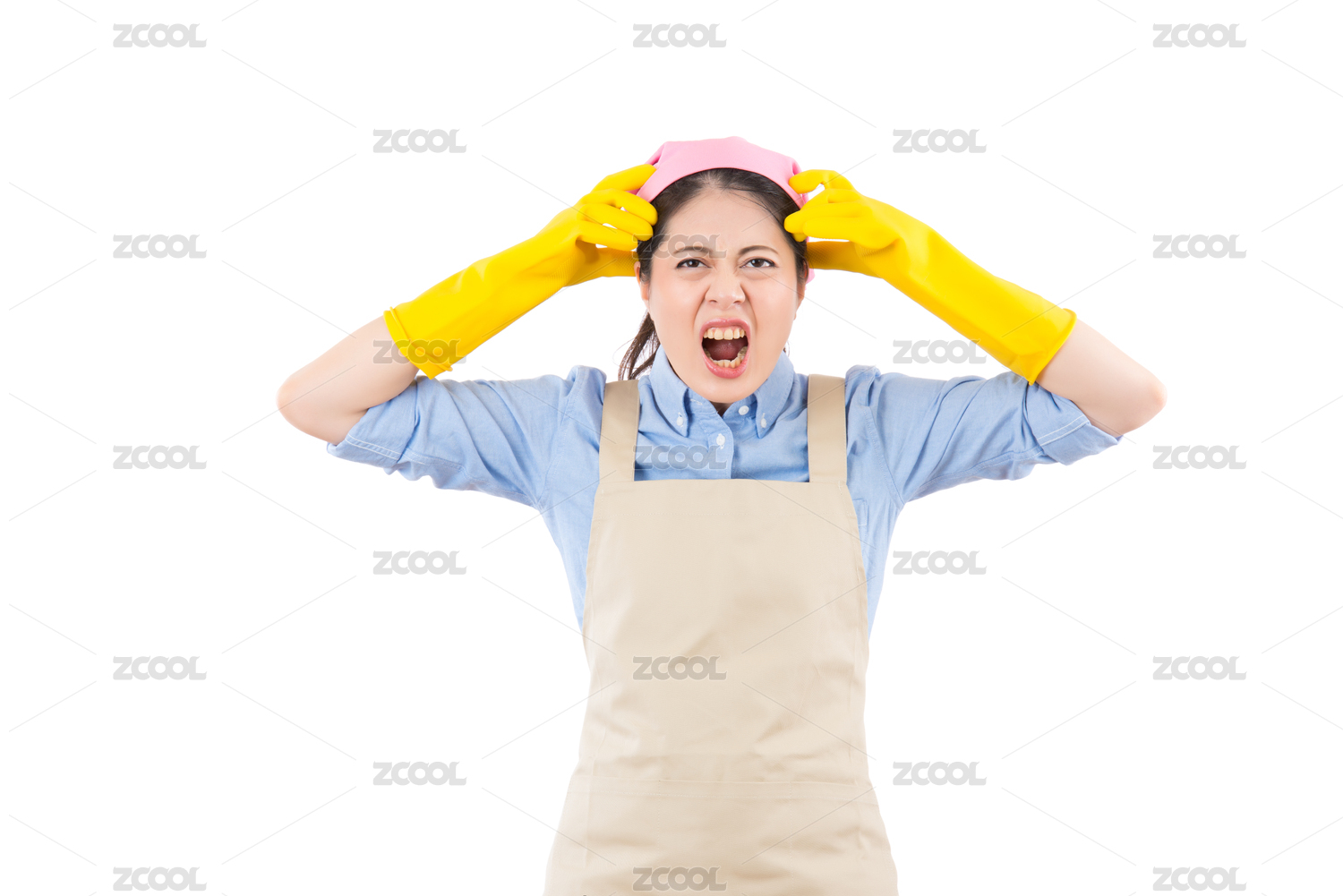 多任務(wù)工作的媽媽感到瘋狂的瘋狂和勞累忙碌的尖叫休息用黃色的清潔手套,在白色背景孤立。家務(wù)勞動(dòng)和家庭觀念。