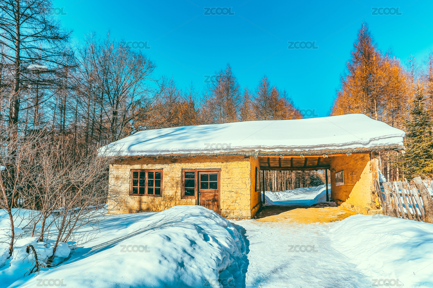 中國黑龍江鄉(xiāng)村的泥土房子 雪蓋住屋頂