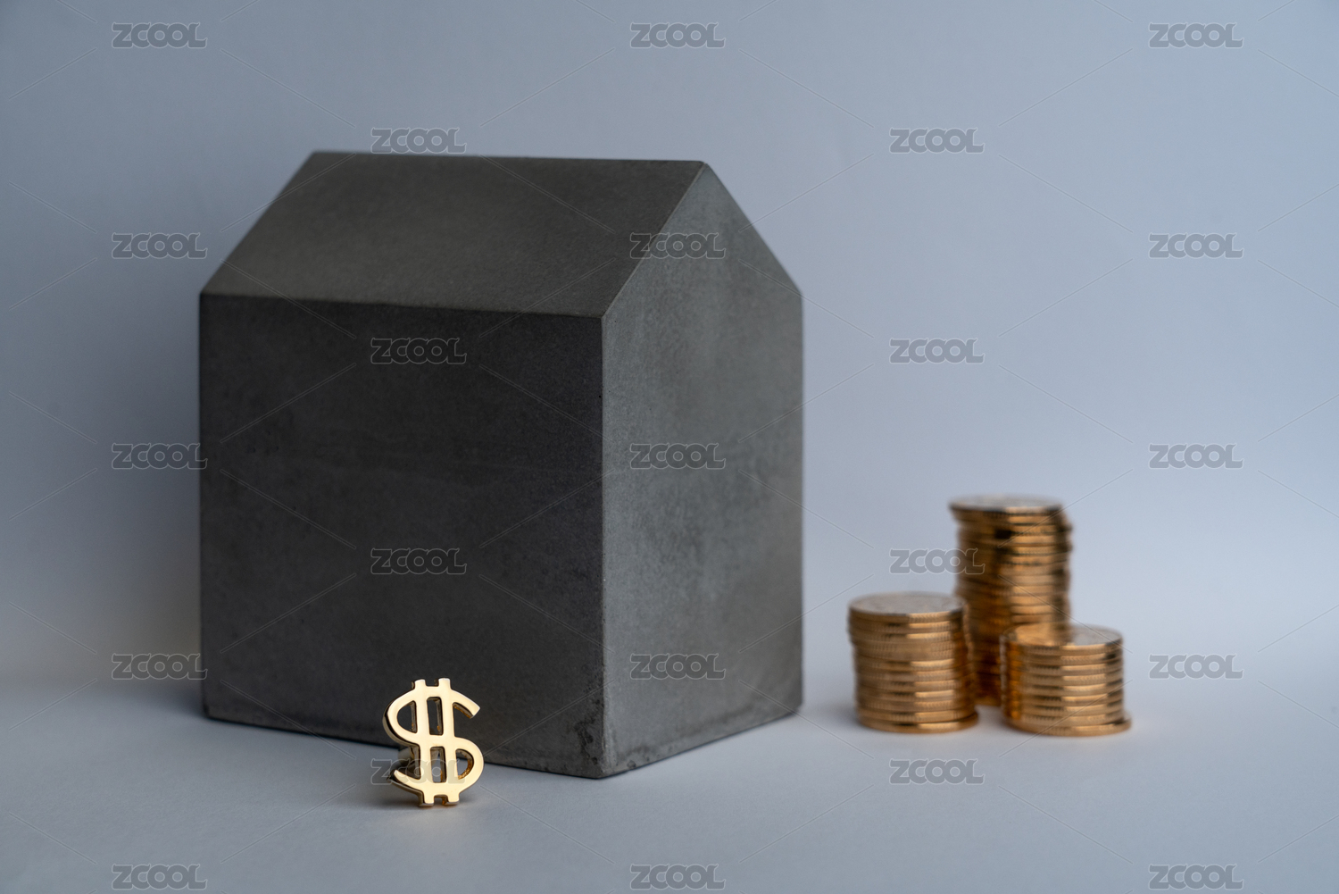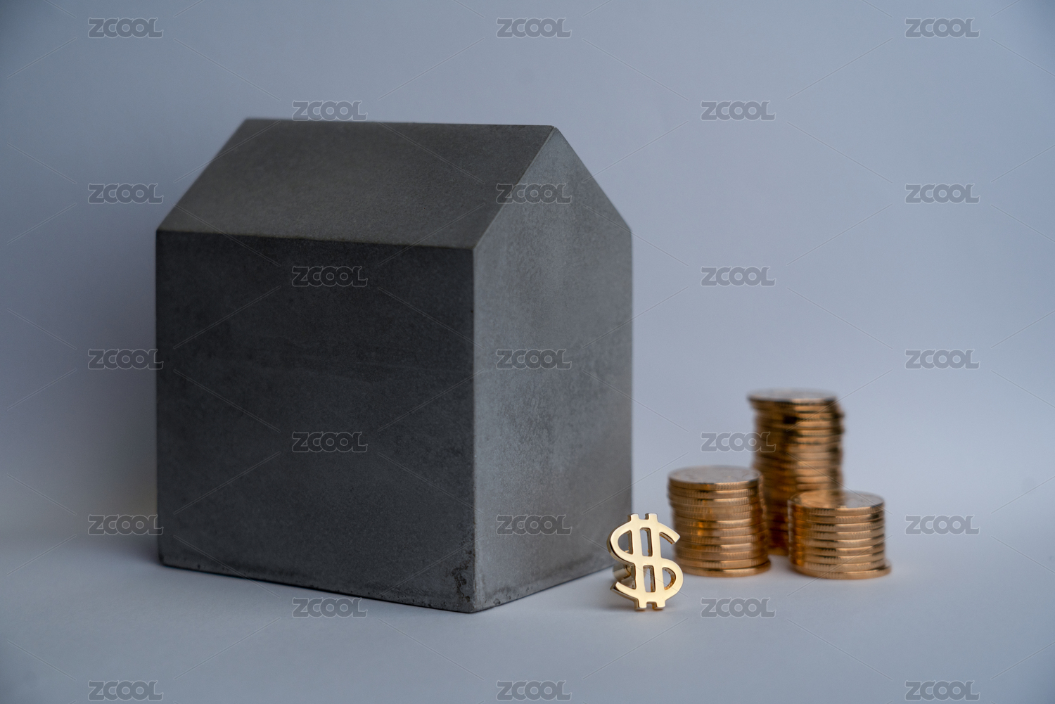 放在混凝土房子模型邊的資金金錢微縮創(chuàng)意