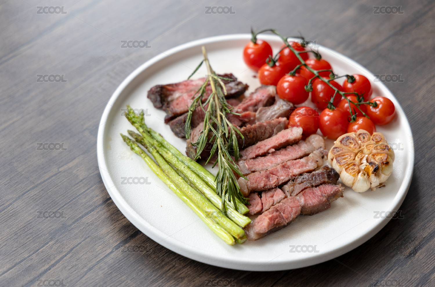 一盤煎眼肉牛排,配菜蘆筍和番茄