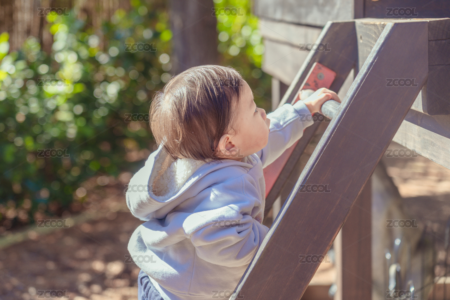 樹林里爬木屋梯子的小男孩