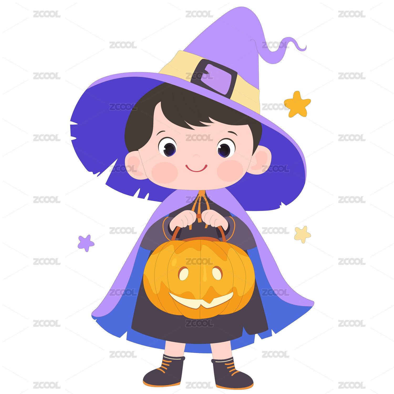 萬圣節(jié)穿斗篷拿南瓜燈小巫師裝扮男孩插畫