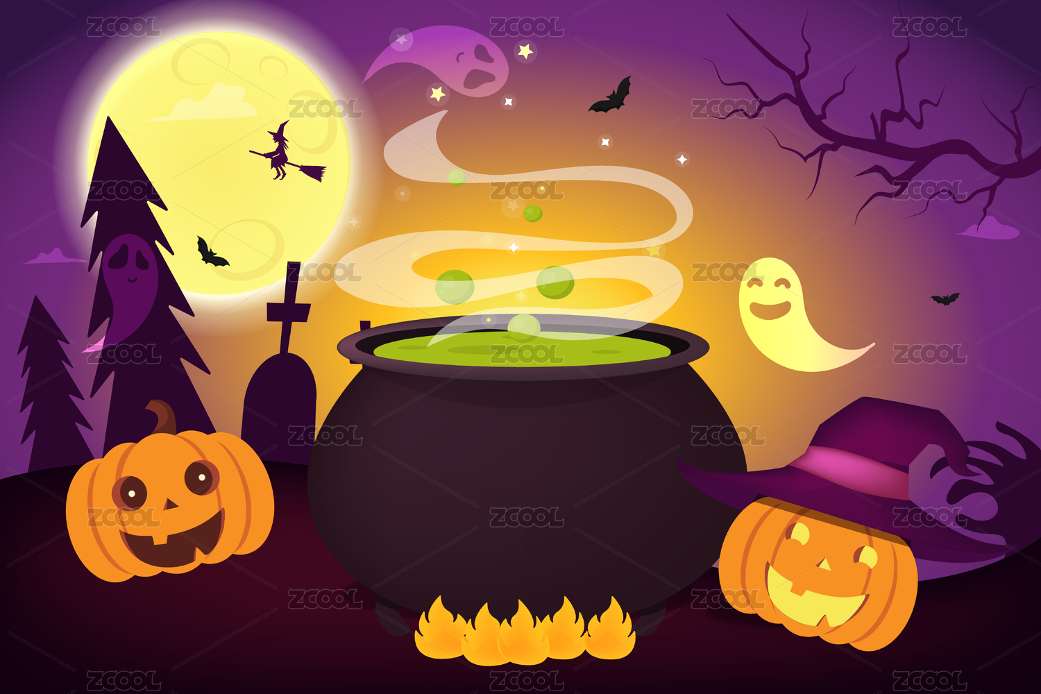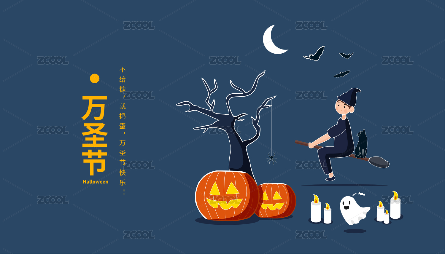 萬圣節(jié)南瓜燈幽靈蝙蝠巫師騎掃把矢量插畫