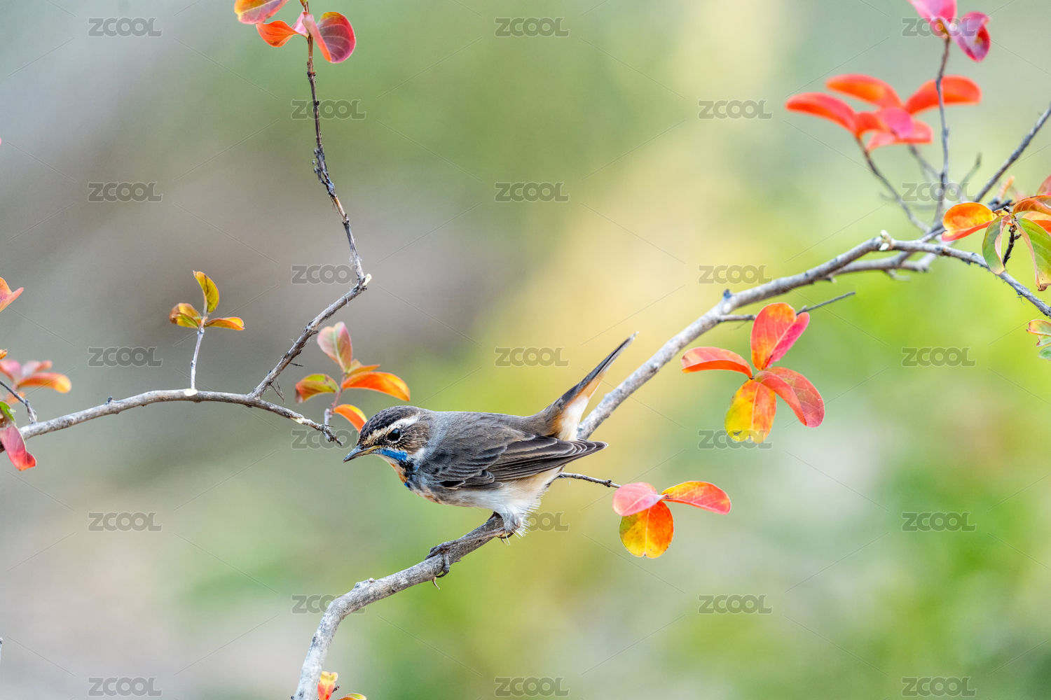 一只藍(lán)喉歌鴝鳥立于花枝上歌唱伺機(jī)覓食