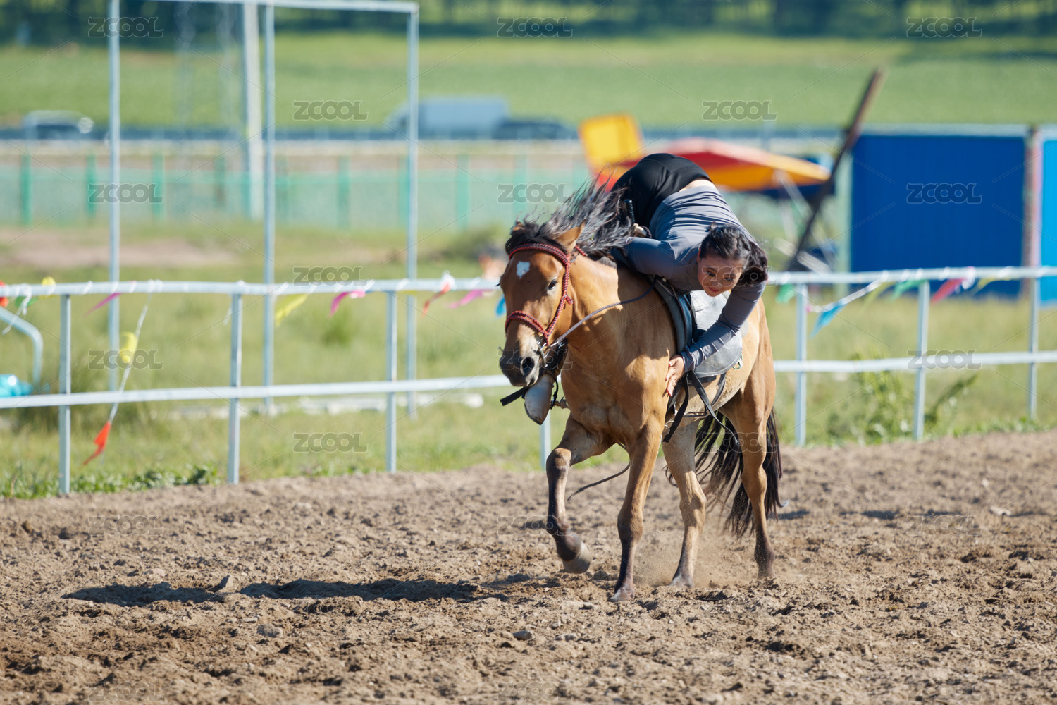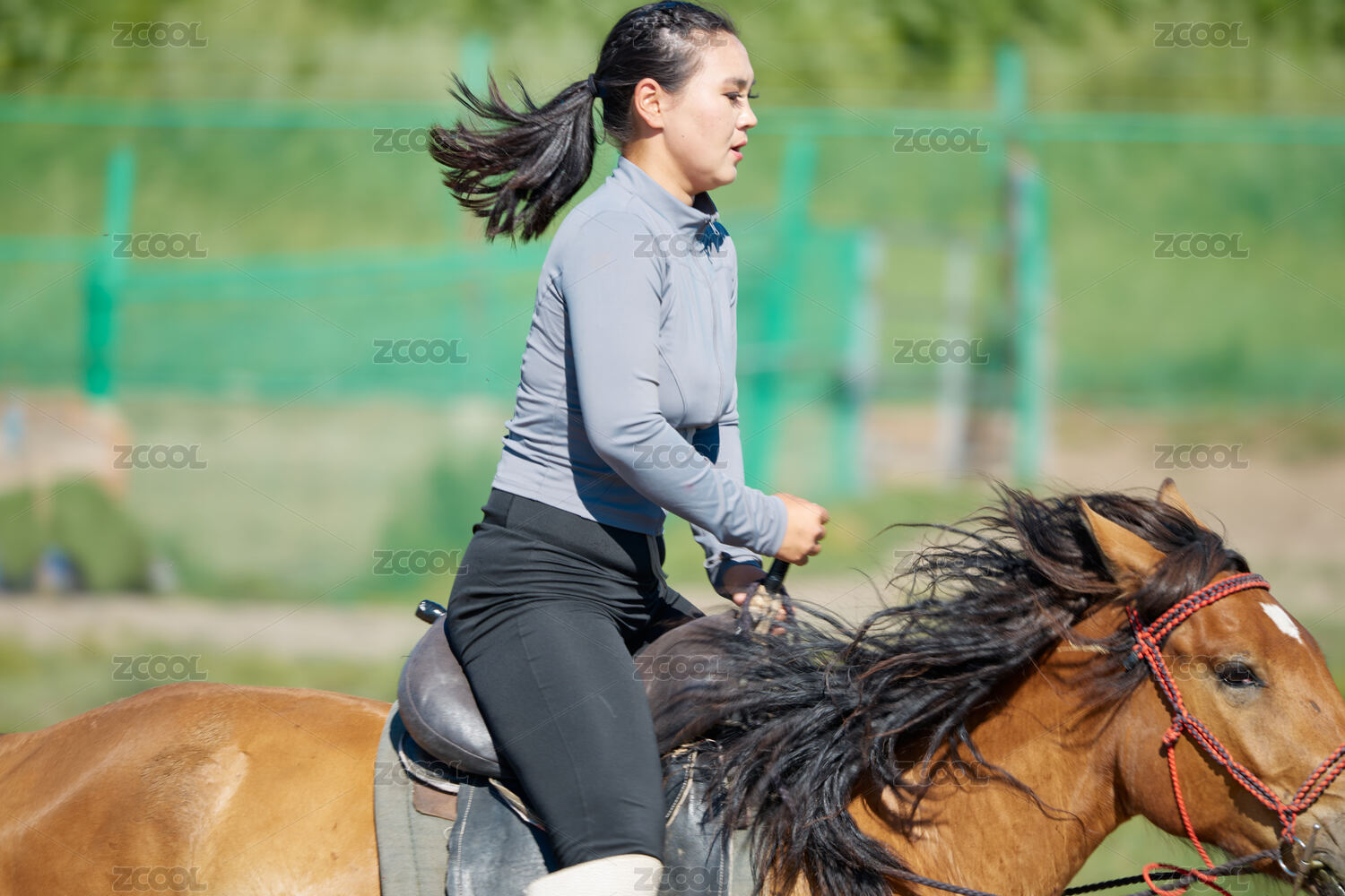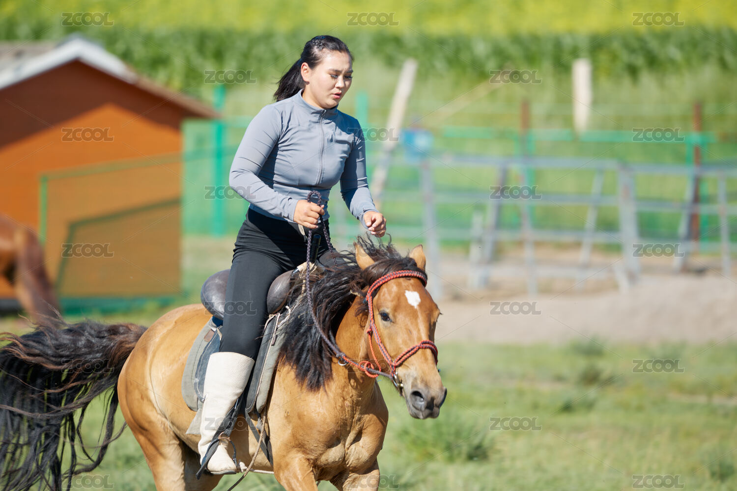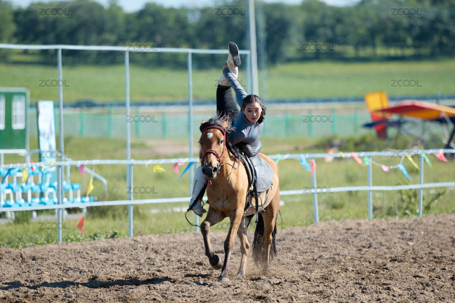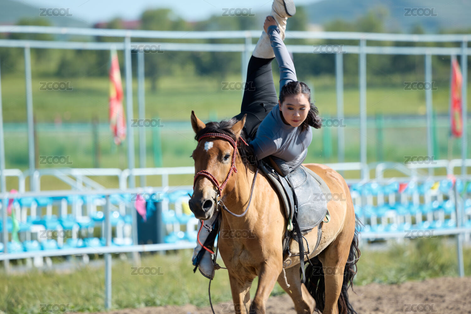 在草原景區(qū)練習(xí)騎馬馬術(shù)的蒙古族演員