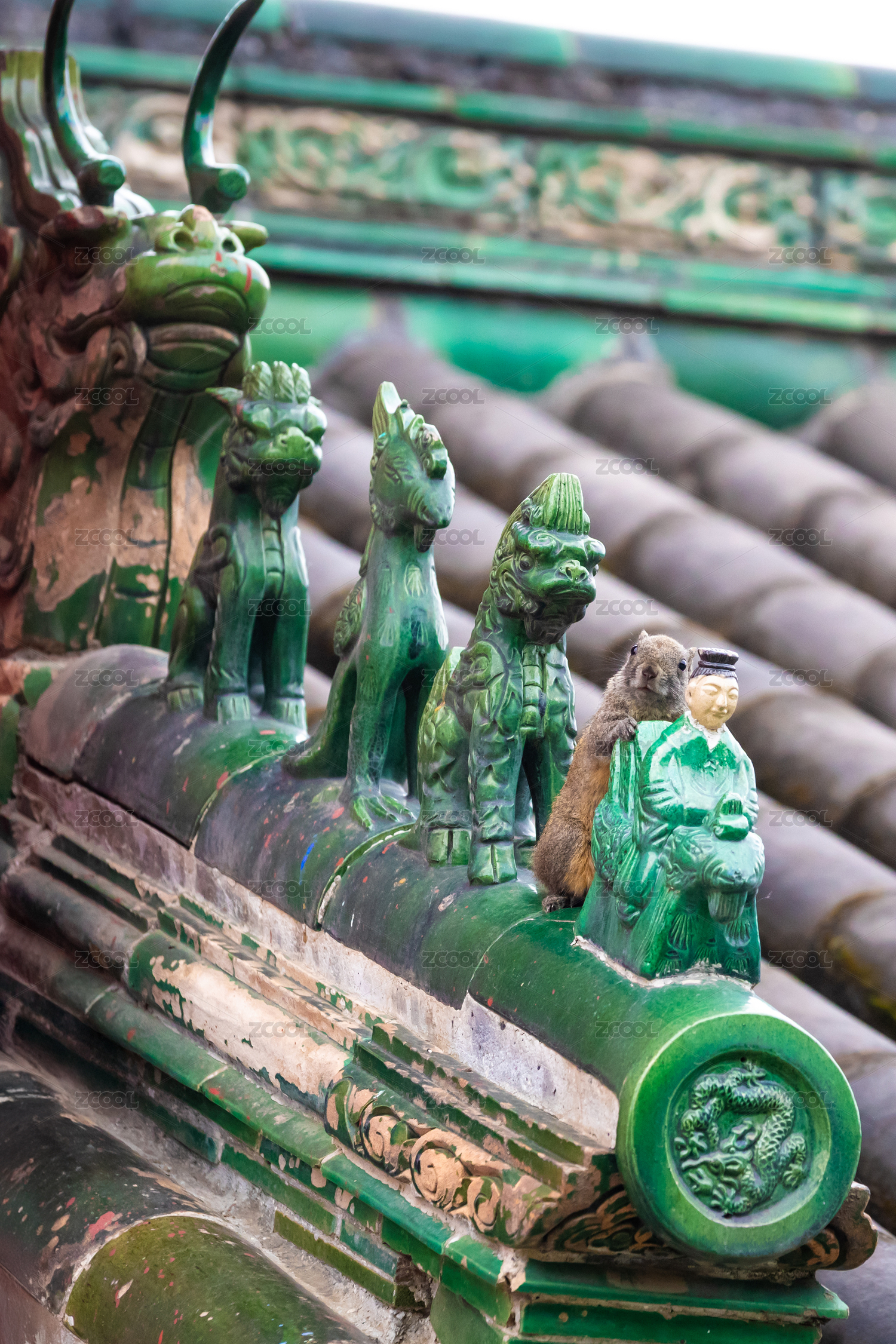 天壇公園琉璃瓦房頂上藏在脊獸后邊的松鼠