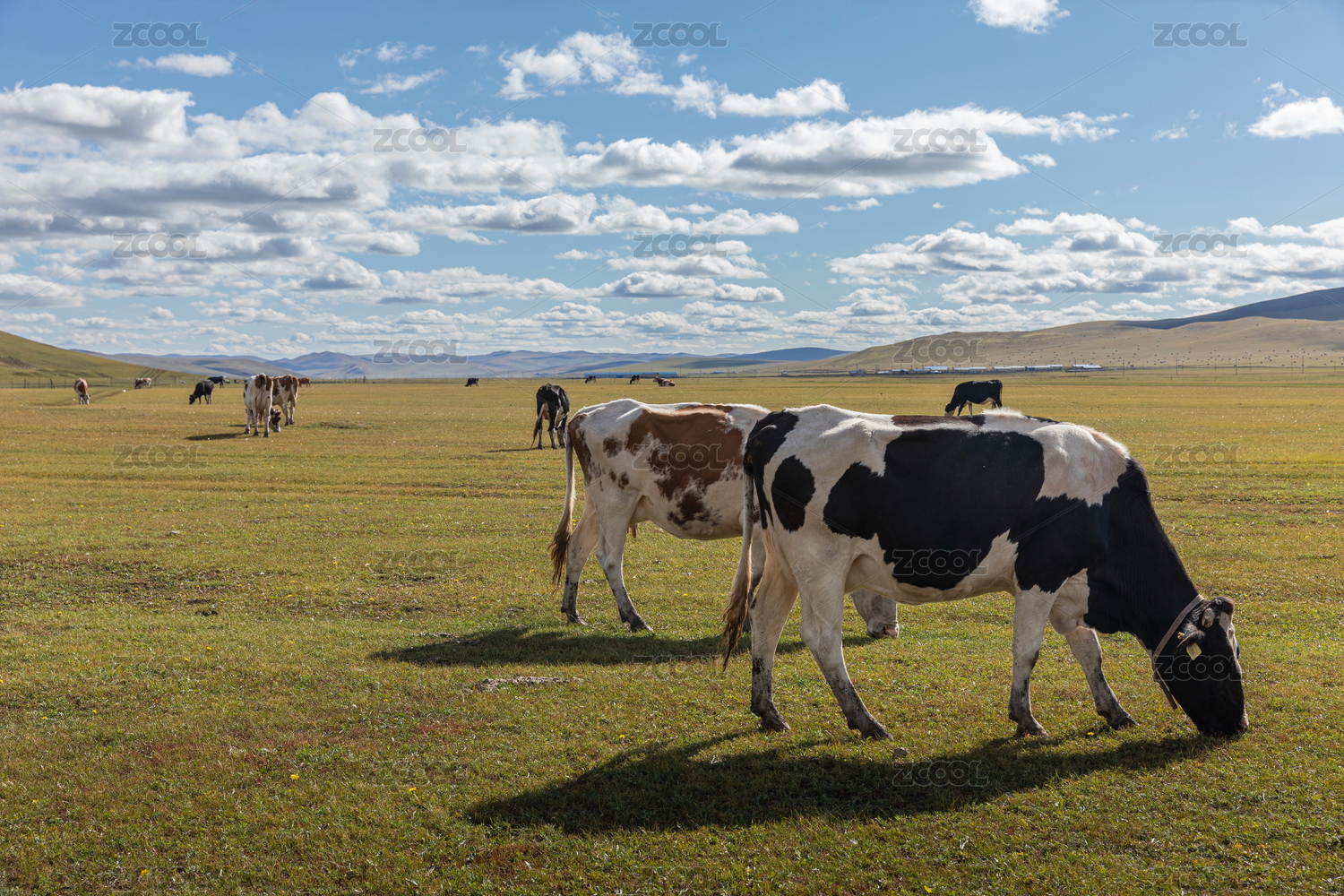 中國(guó)內(nèi)蒙古呼倫貝爾大草原悠閑吃草的牛群