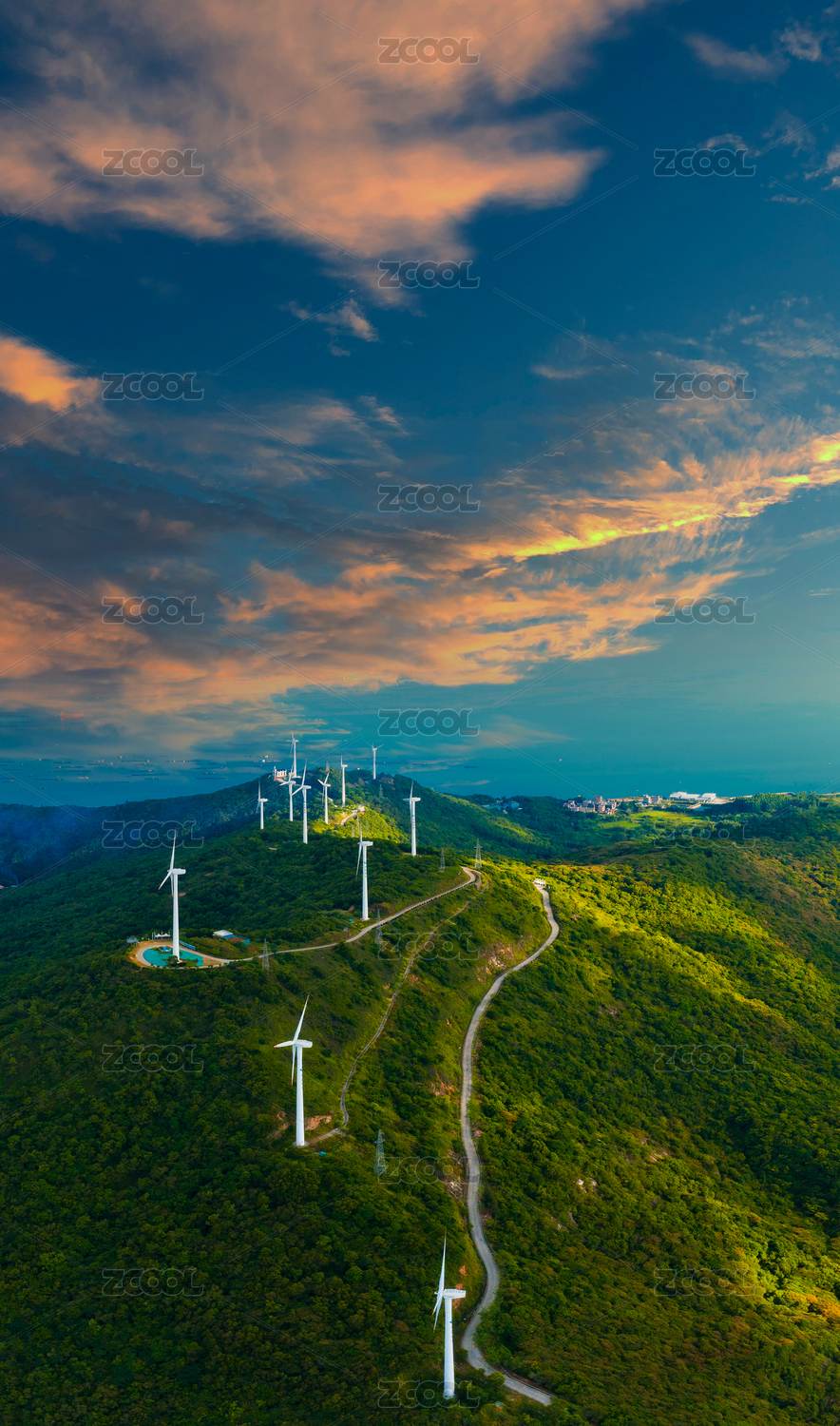 草原公路與風(fēng)輪機大風(fēng)車天空背景