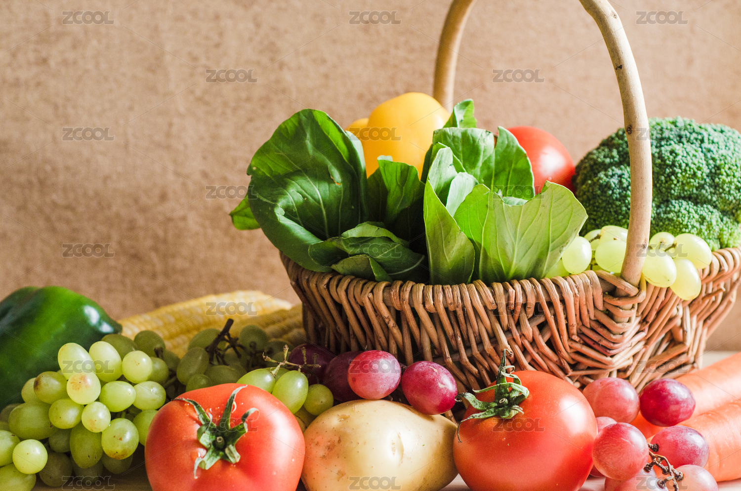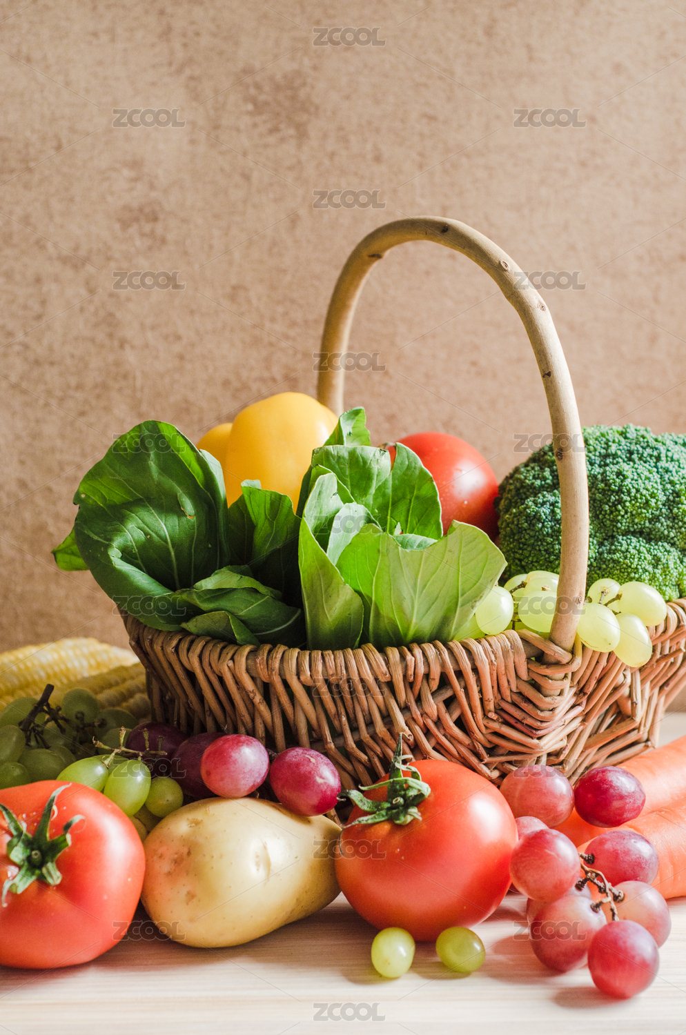 木桌子上菜籃子里的新鮮的水果蔬菜