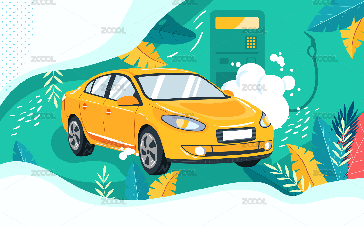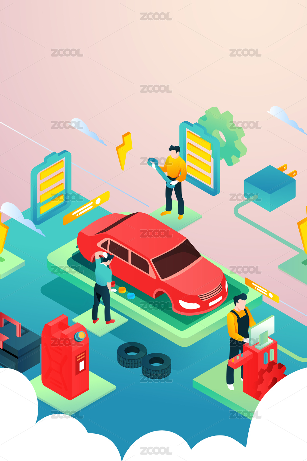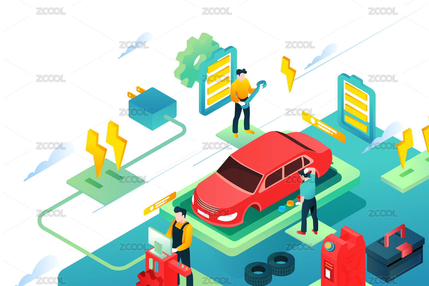 卡通2.5D汽車維修保養(yǎng)活動(dòng)充電矢量背景插畫