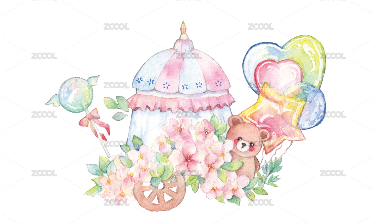 水彩卡通可愛風兒童插畫玩具熊和卡通氣球