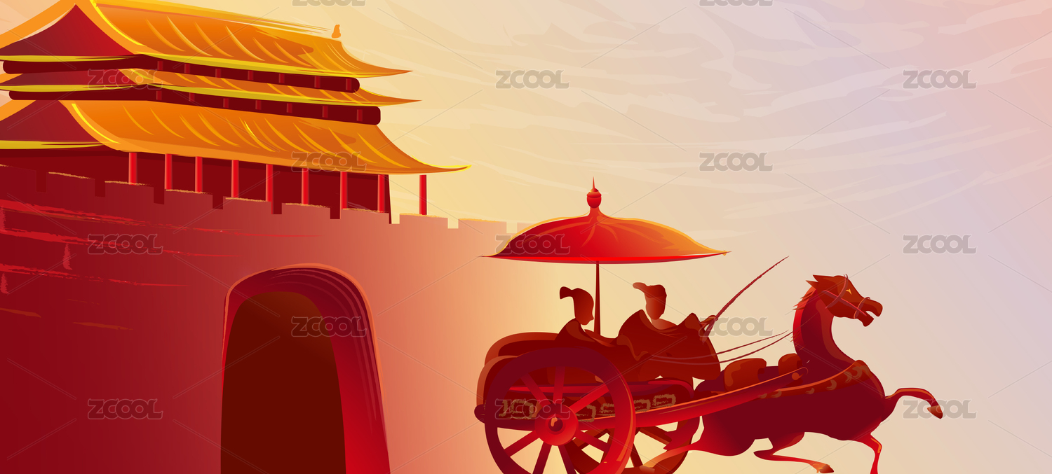 中國風建筑古城古人出城圖插畫