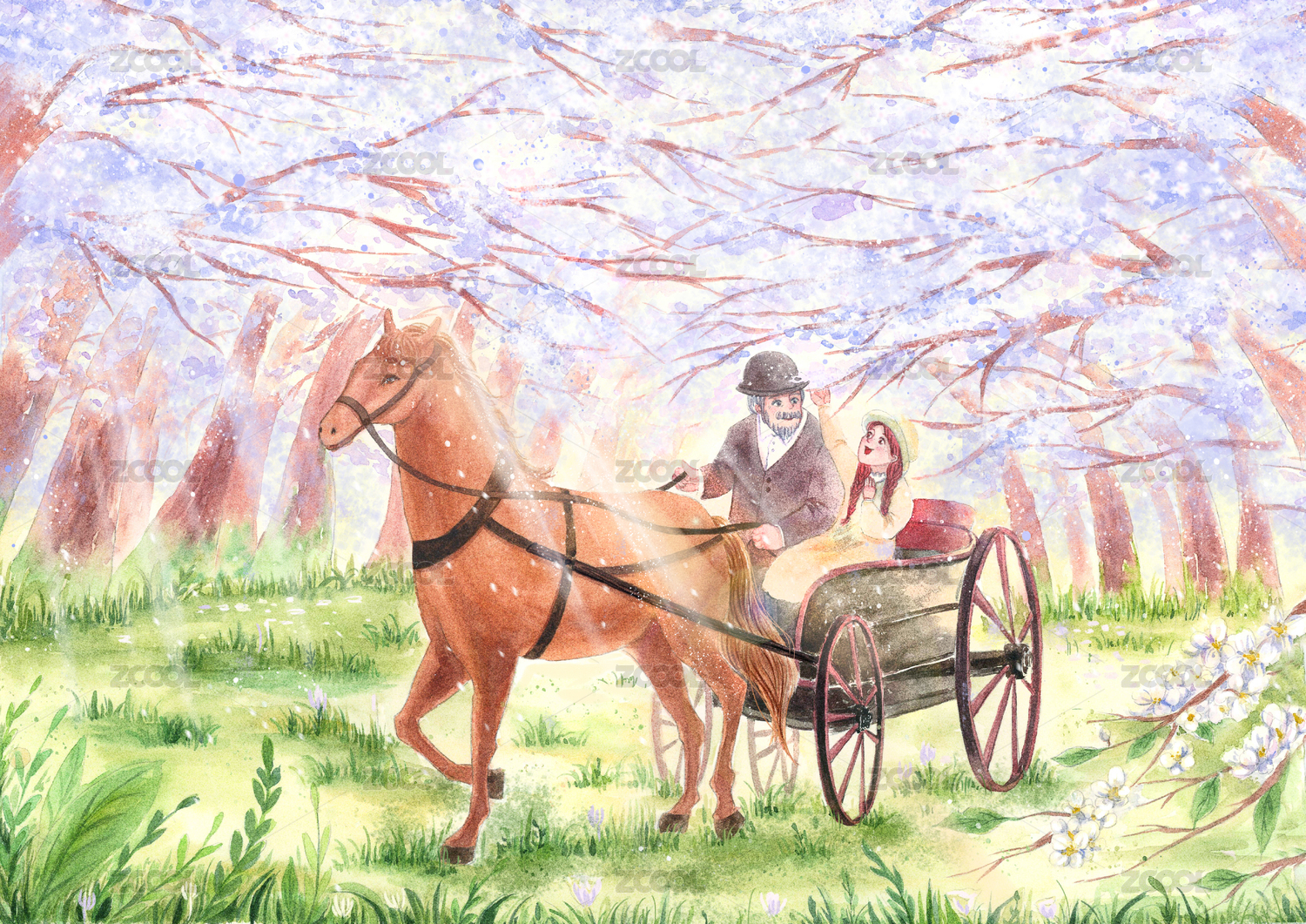 坐在馬車上看著樹上的花叢