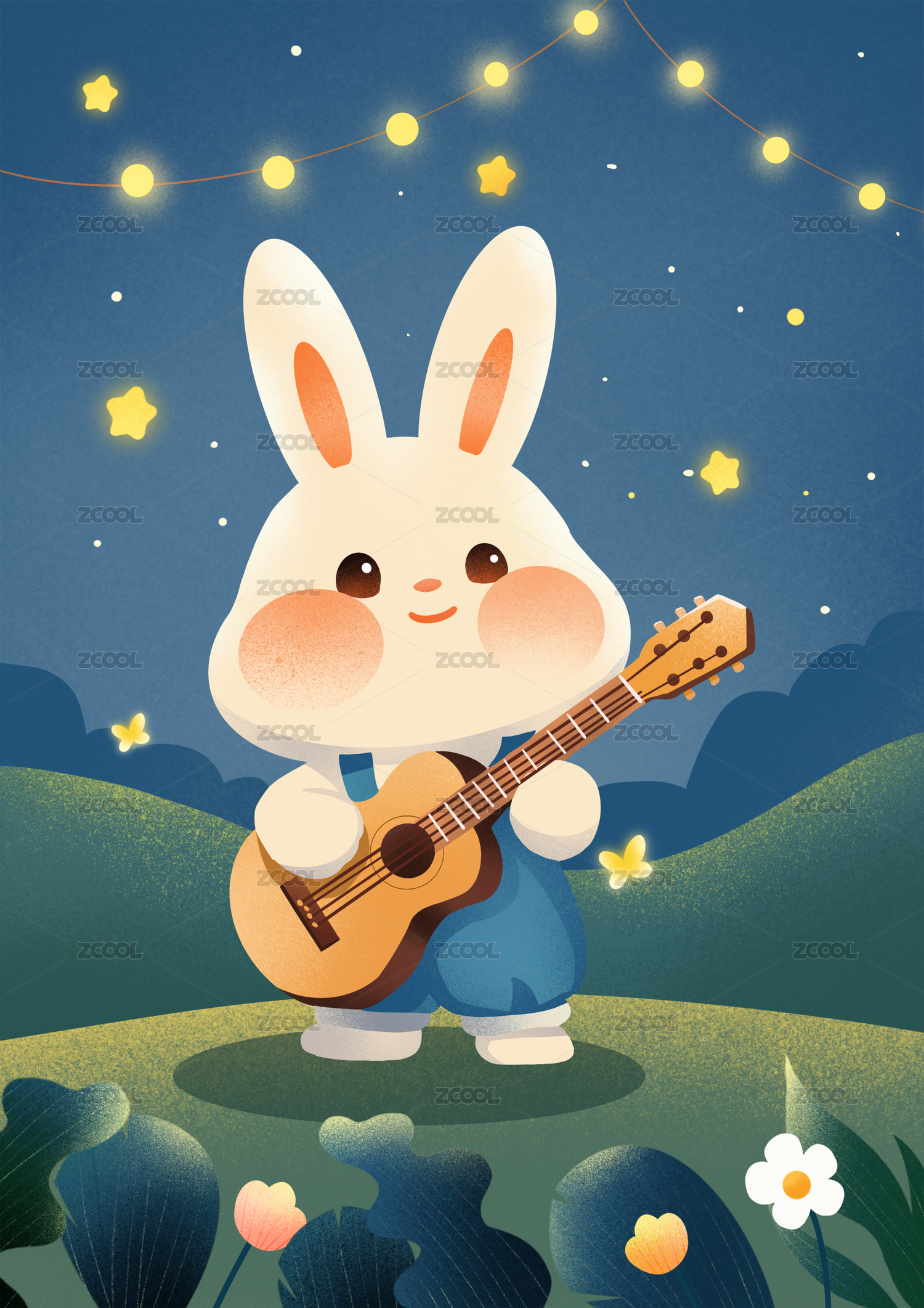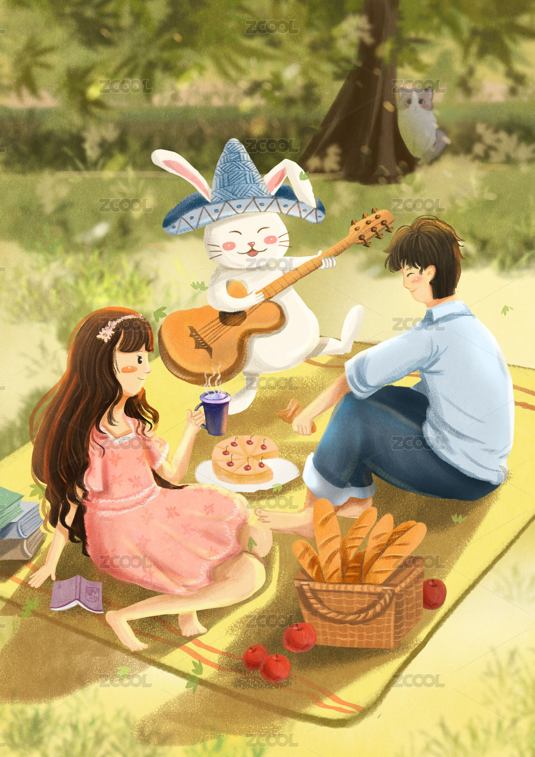夏日情侶和兔子彈吉他野餐相伴旅游場(chǎng)景