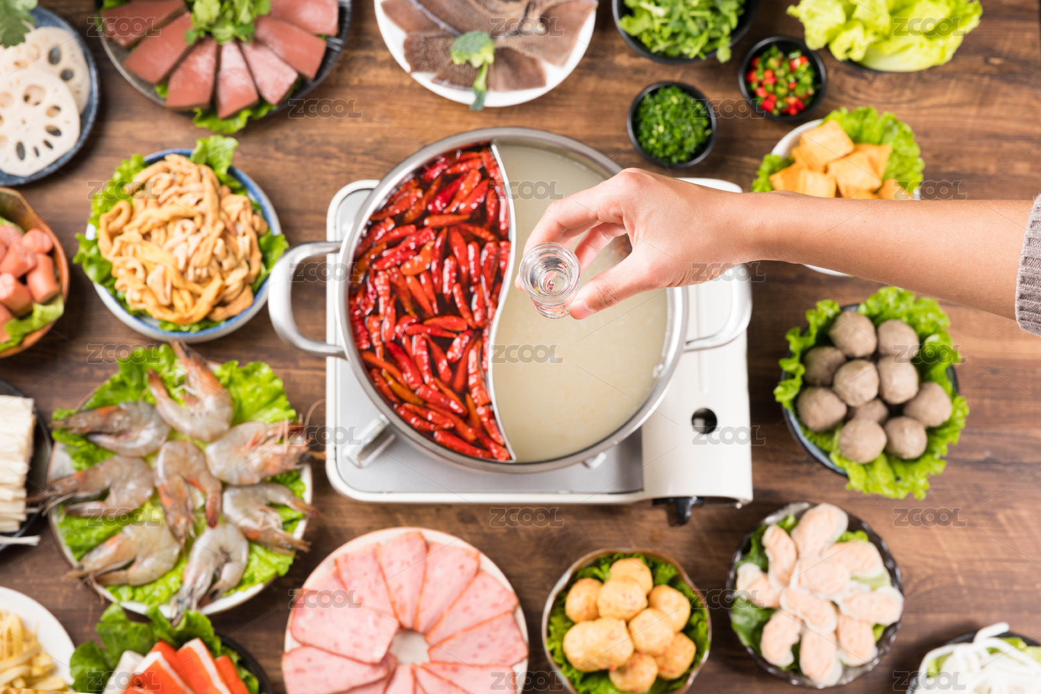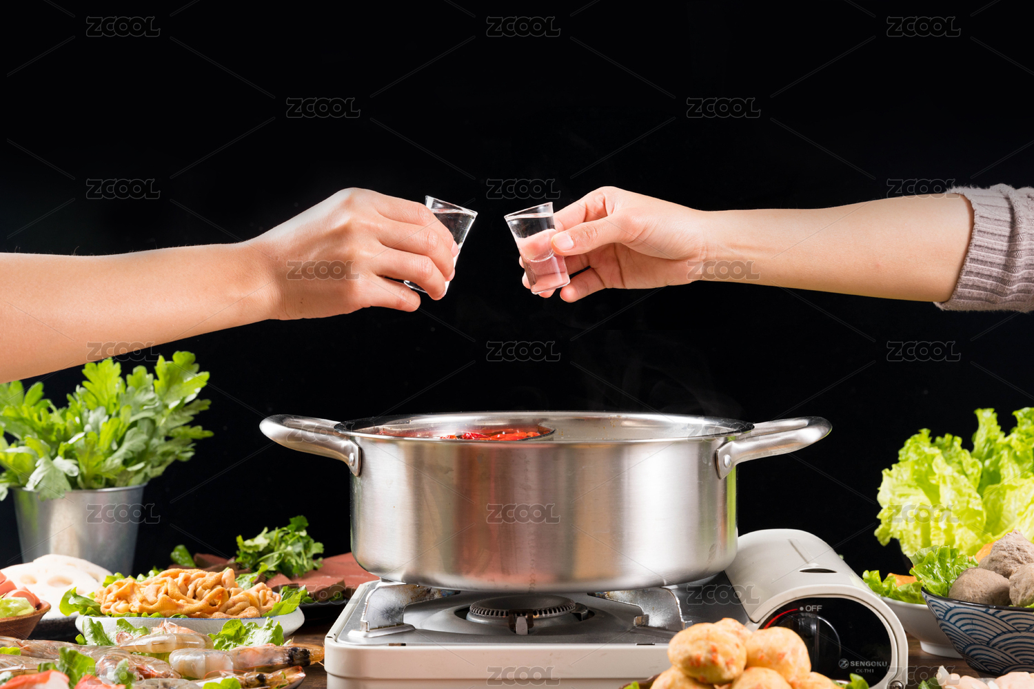 手拿裝有白酒的子彈杯放著鴛鴦火鍋上方準(zhǔn)備碰杯