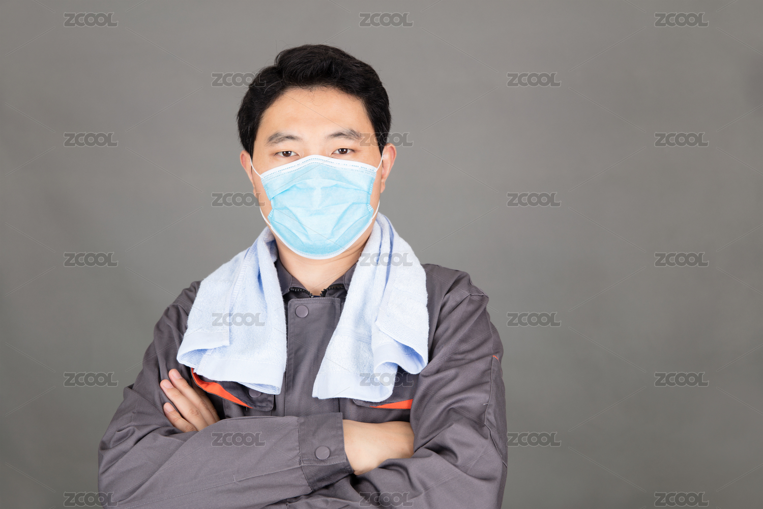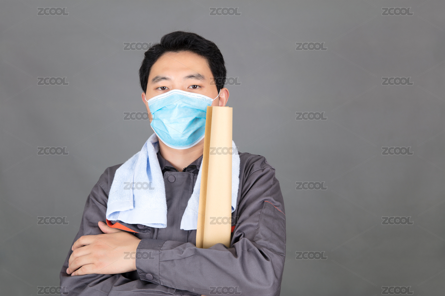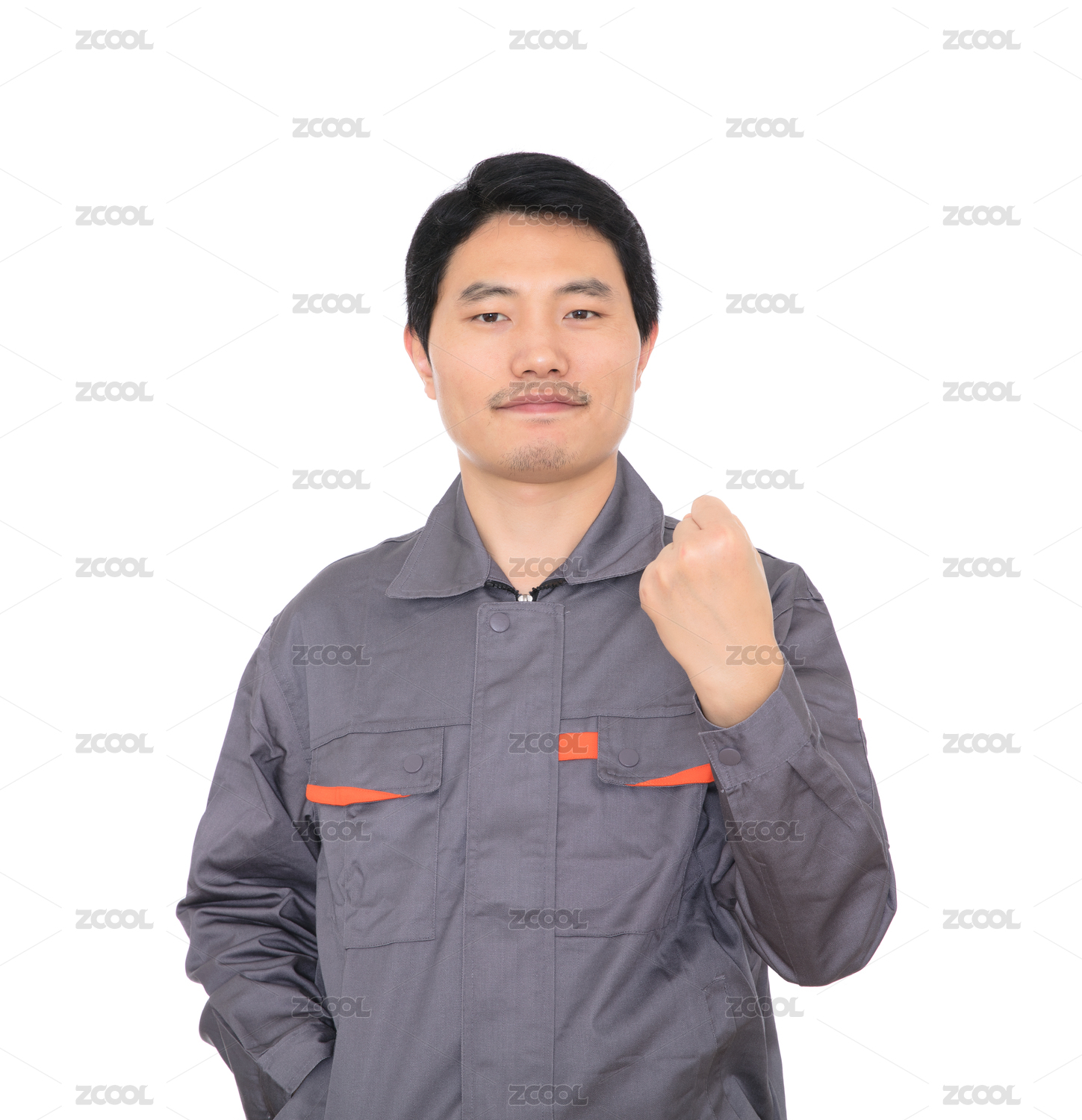 白背景前握拳抬手給自己鼓氣的年輕工人